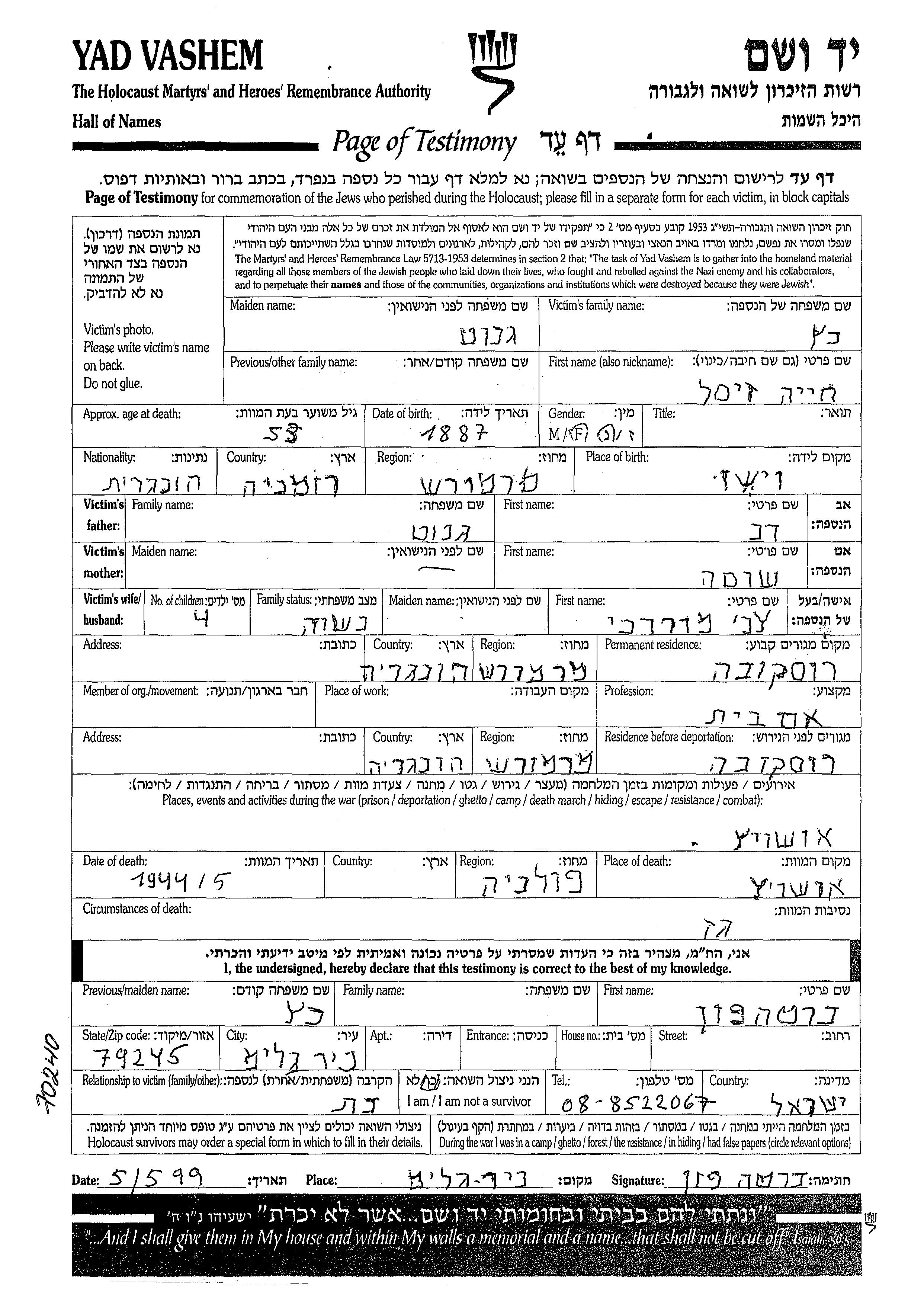 Khaia Zysl Katz, geb. Genut wurde im Jahr 1887 in Viseu, Rumänien geboren. Sie war die Tochter von Dov und Shoshana. Sie war Hausmutter und mit Tzvi Mordechai Verheiratet. Vor dem Zweiten Weltkrieg lebte sie in Ruscova, Rumänien. Während des Krieges war sie in Ruscova, Rumänien.