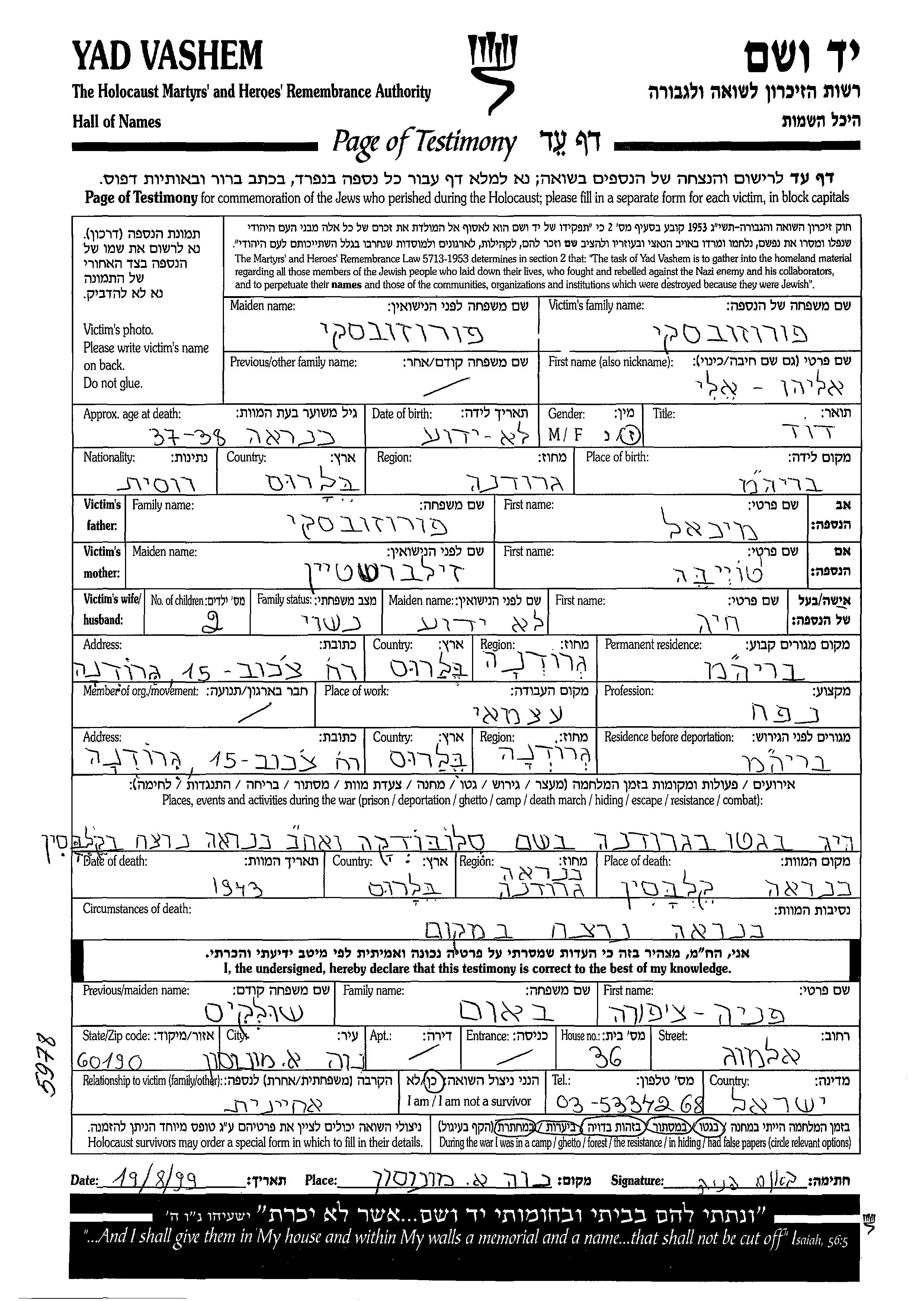 Eliahu Eli Porozovski wurde in Grodno, Polen geboren. Er war der Sohn von Mikhael und Toibe. Er war Schmied und mit Khaia Verheiratet. Vor dem Zweiten Weltkrieg lebte er in Grodno, Polen. Während des Krieges war er in Grodno, Polen.