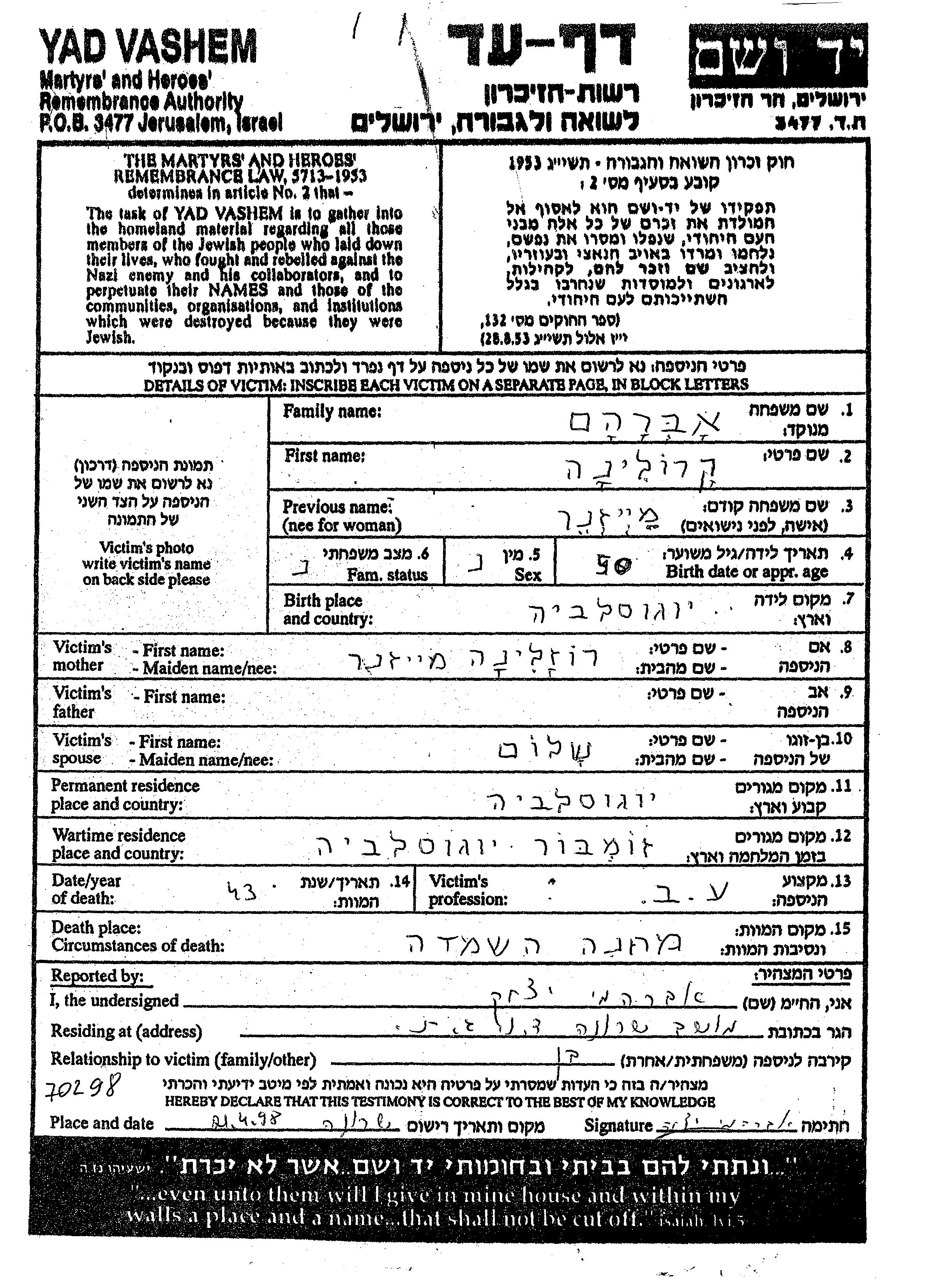 Karolina Avraham, geb. Meizner wurde in Jugoslawien geboren. Sie war die Tochter von Rozalinda. Sie war Hausfrau und mit Shalom Verheiratet. Vor dem Zweiten Weltkrieg lebte sie in Jugoslawien. Während des Krieges war sie in Zombor, Jugoslawien.