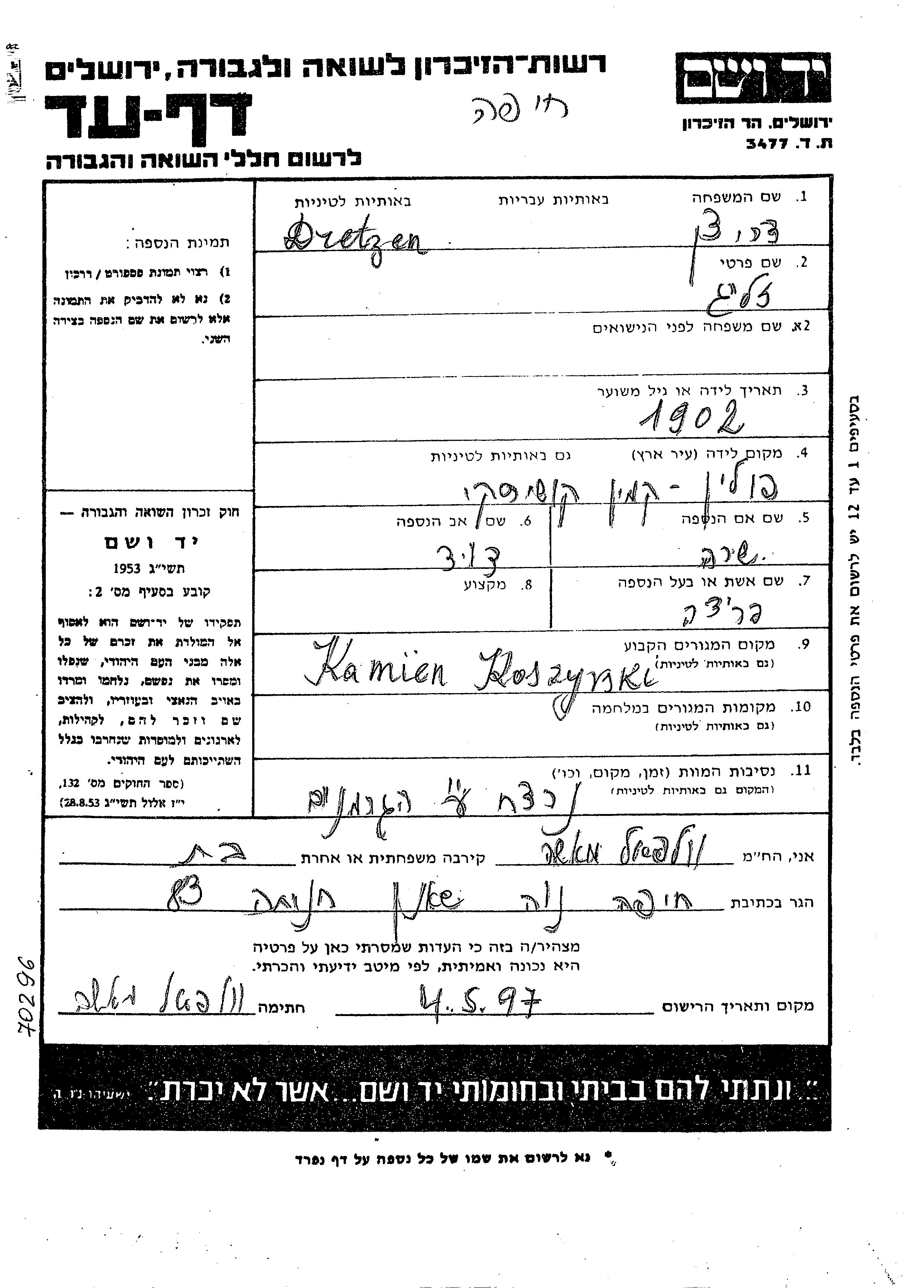 Zelig Dretzen wurde im Jahr 1902 in Kamin Koshirski, Polen geboren. Er war der Sohn von David und Sara. Vor dem Zweiten Weltkrieg lebte er in Kamin Koshirski, Polen.