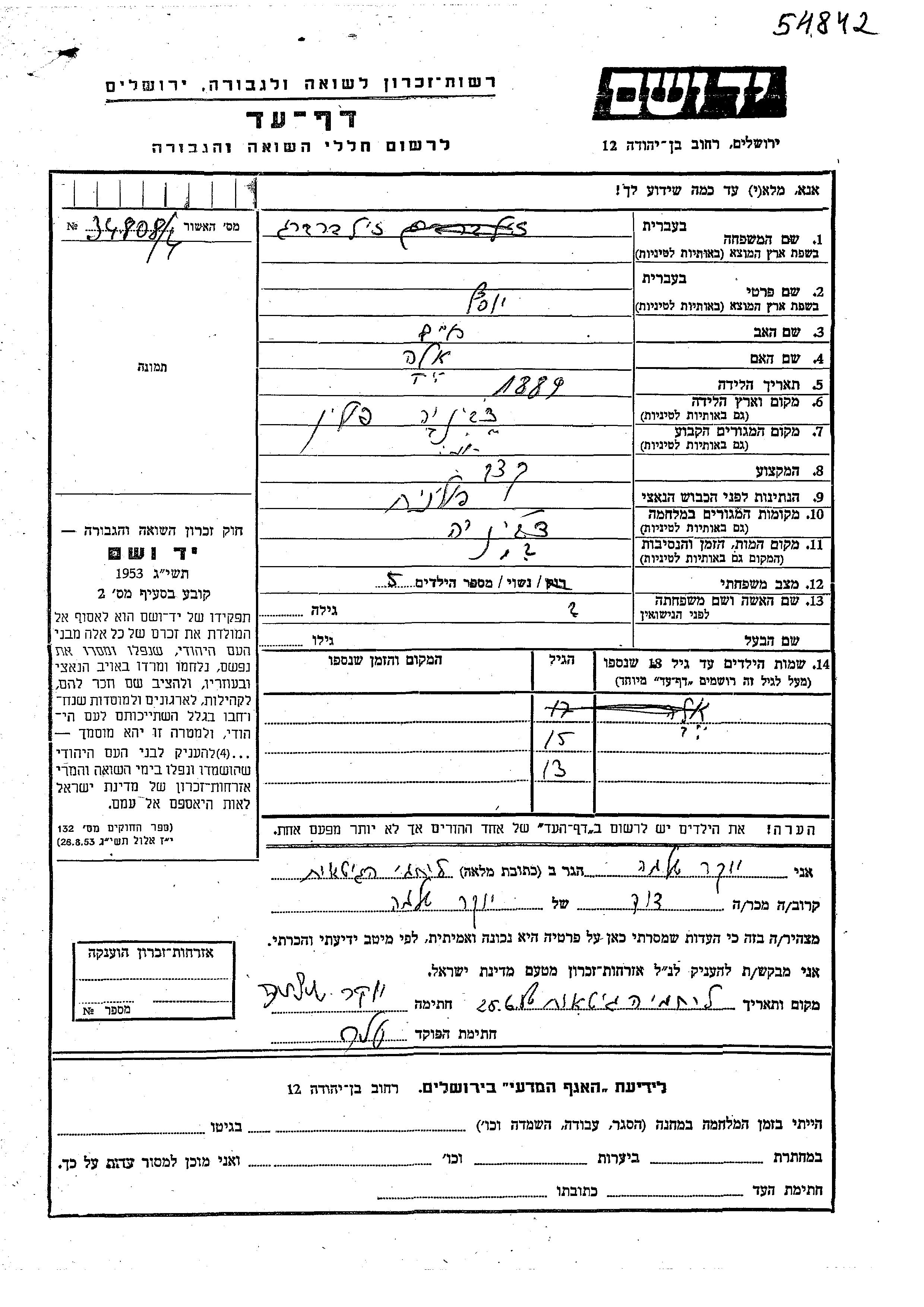 Yosef Zilberberg wurde im Jahr 1889 in Trzebinia, Polen geboren. Er war der Sohn von Khaim und Ela. Er war Metzger/-in und Verheiratet. Vor dem Zweiten Weltkrieg lebte er in Trzebinia, Polen. Während des Krieges war er in Trzebinia, Polen.