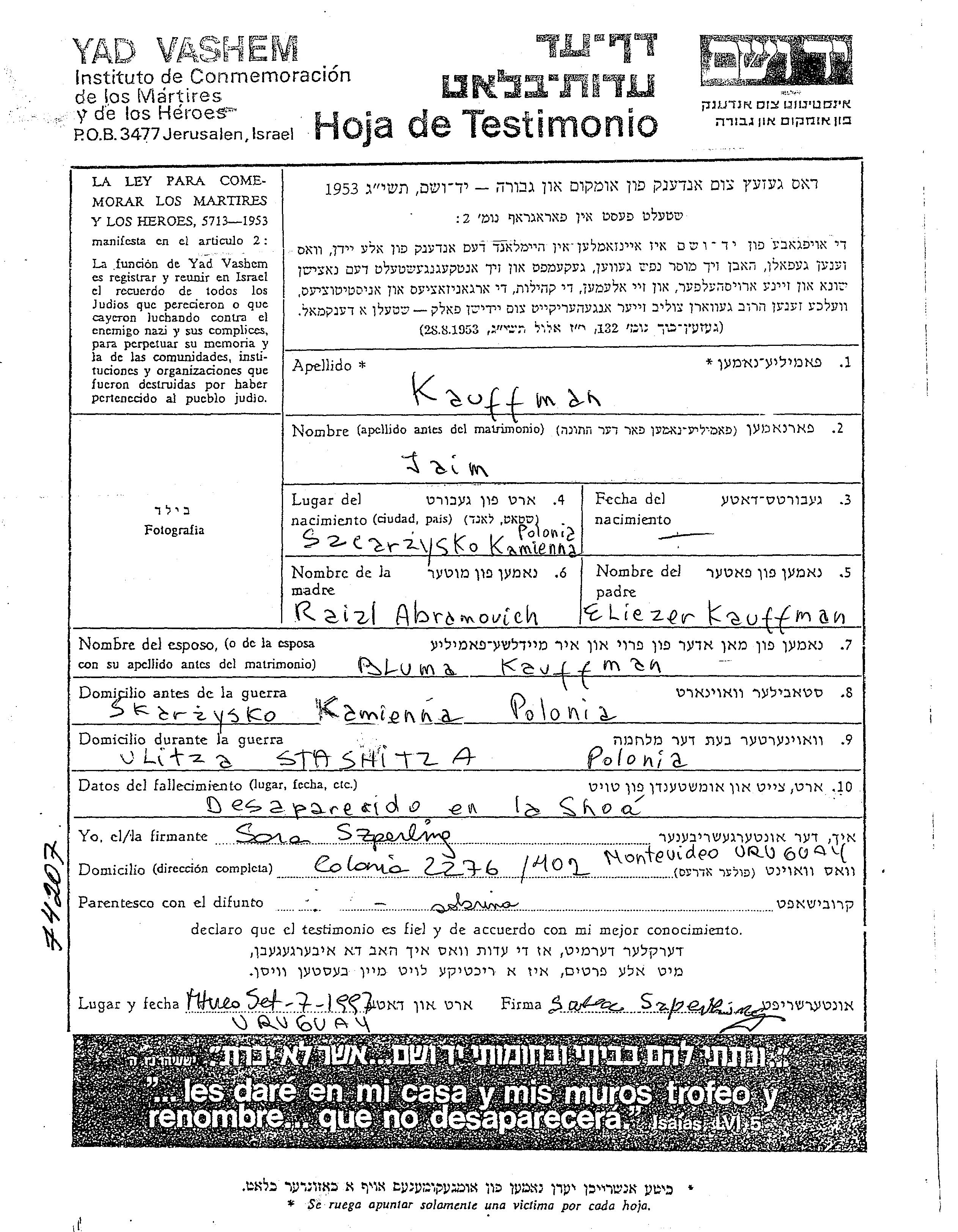 Jaim Kauffman wurde in Skarzysko Kamienna, Polen geboren. Er war der Sohn von Eliezer und Raizl. Er war mit Bluma Verheiratet. Vor dem Zweiten Weltkrieg lebte er in Skarzysko Kamienna, Polen. Während des Krieges war er in Skarzysko Kamienna, Polen.