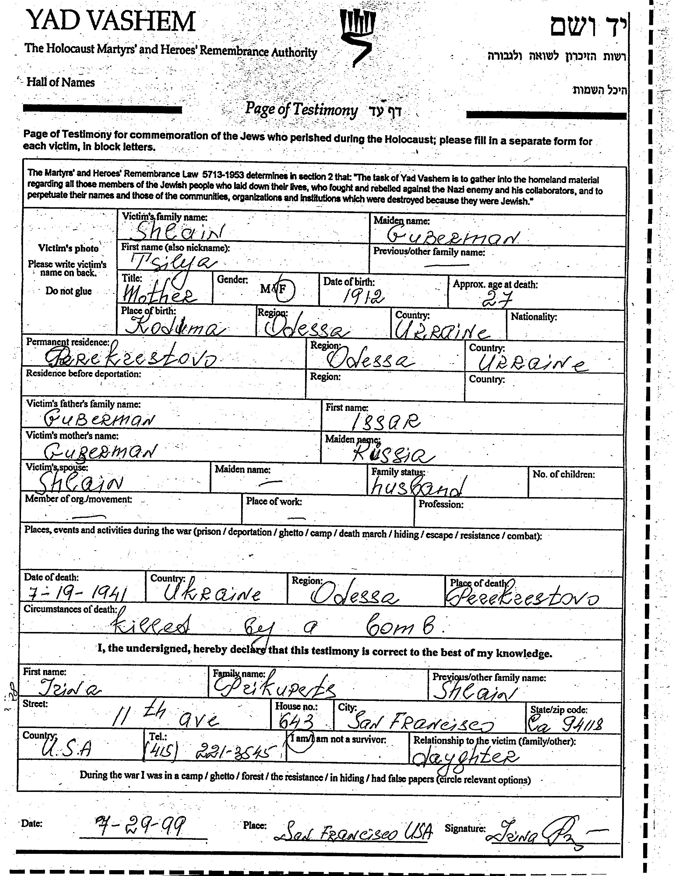 Juden wurden in der Schoah auf verschiedenste Weisen ermordet, unter anderem: Vergasen, Erschiessen, lebendig verbrannt werden, lebendig begraben werden, Tod durch Erschöpfung durch Zwangsarbeit, Epidemien, mangels jeder hygienischer Bedingung oder dem Fehlen medizinischer Versorgung. Manche Juden nahmen sich das Leben, um der Festnahme und weiterer Verfolgung zu entgehen oder ihr hoffnungsloses, nicht nachlassendes Leiden zu beenden.