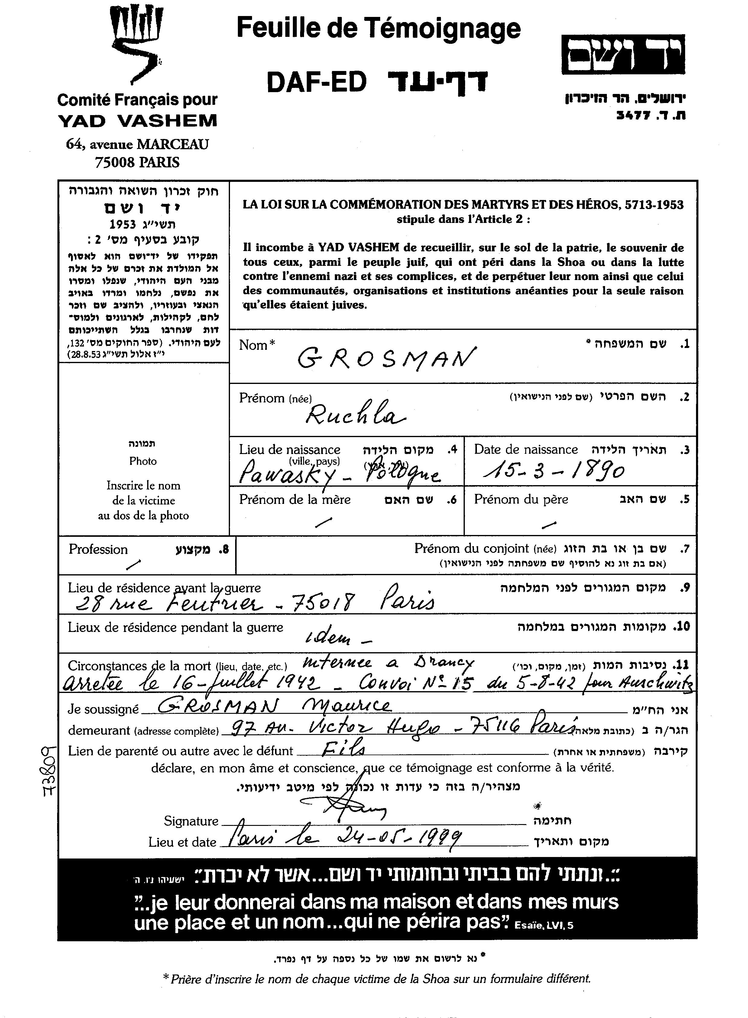 Grosman Ruchla 1890 Paris, Frankreich Gedenkblatt
