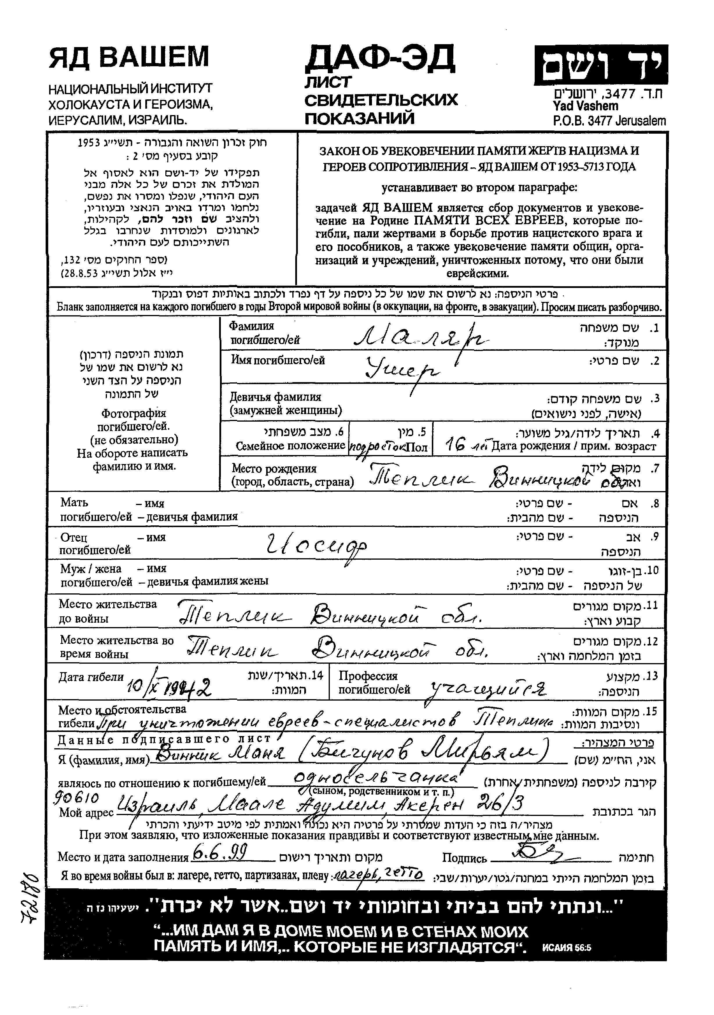 Usher wurde in der Schoah ermordet. Todesort: Teplik, Ukraine (UdSSR) im Jahr 1942.