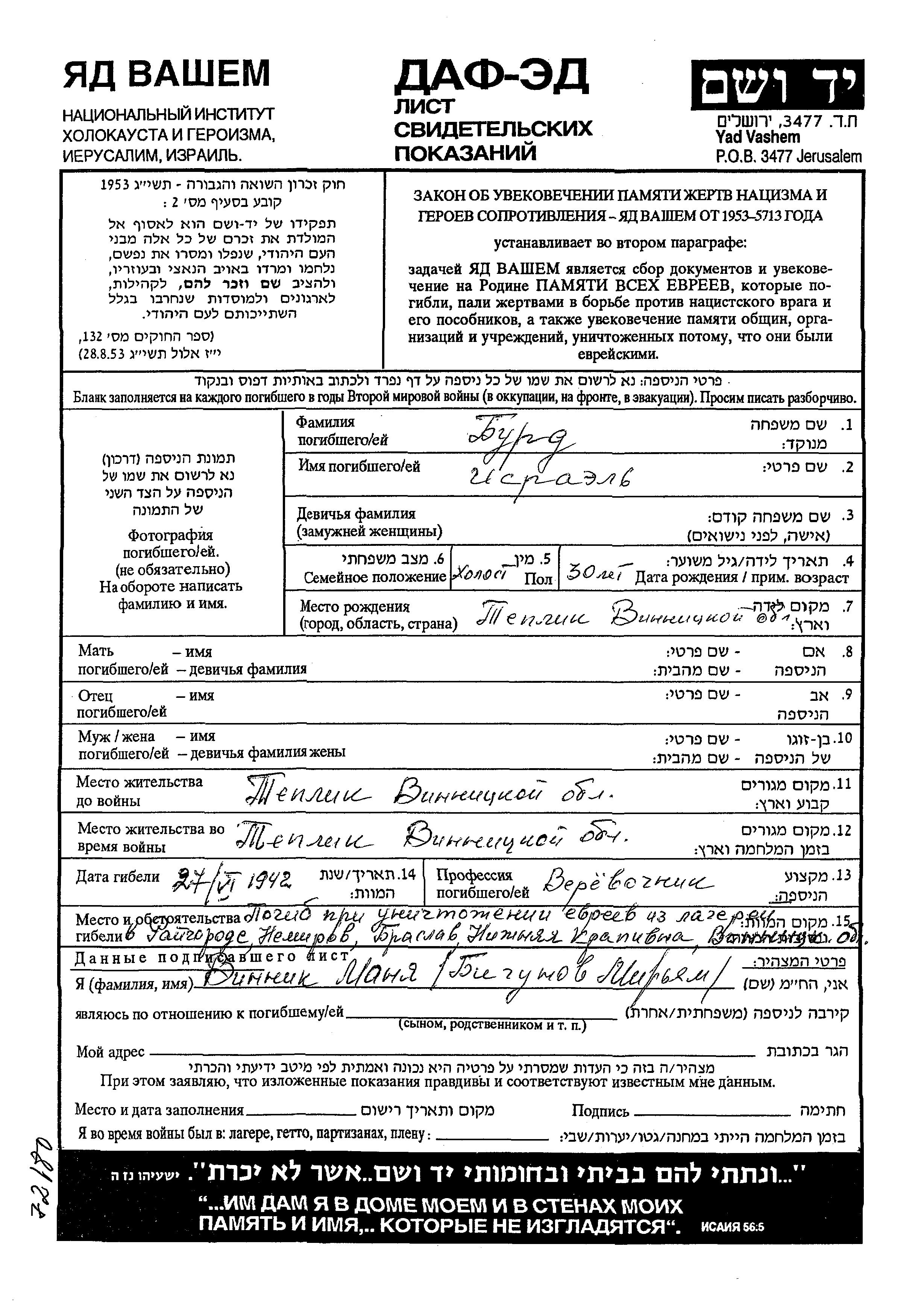 Israel Burd wurde in Teplik, Ukraine (UdSSR) geboren. Er war Veriovochnik und Ledig. Vor dem Zweiten Weltkrieg lebte er in Teplik, Ukraine (UdSSR). Während des Krieges war er in Teplik, Ukraine (UdSSR).