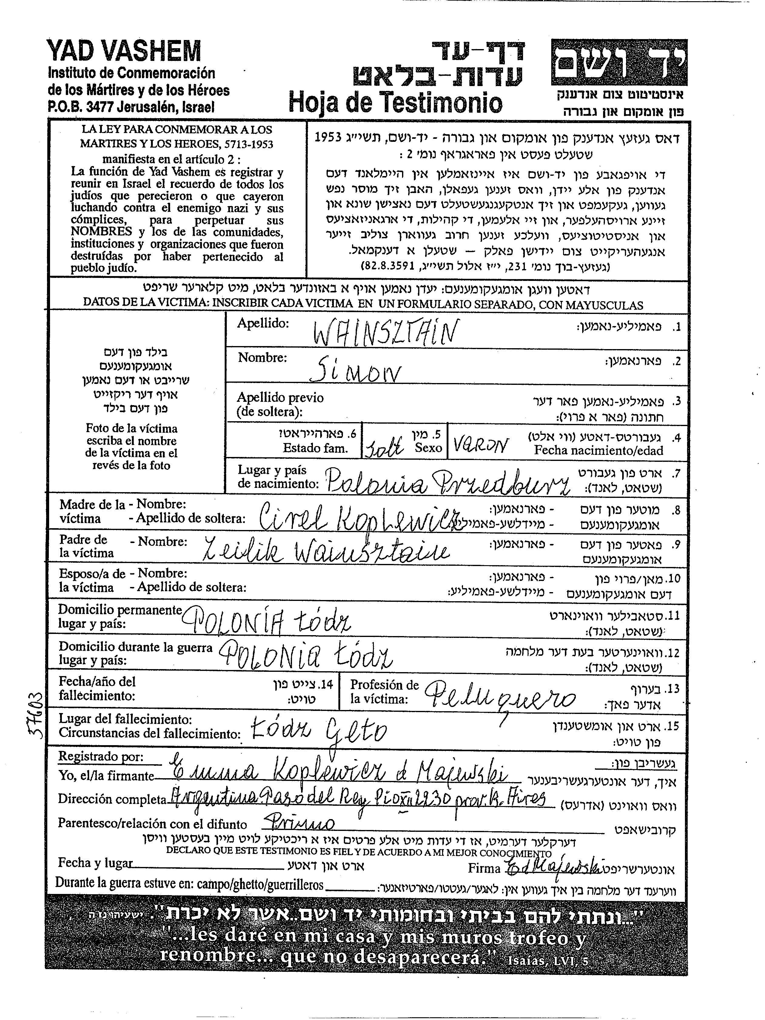 Simon Wainsztain wurde in Przedborz, Polen geboren. Er war der Sohn von Zeilik und Cirel. Er war Peluquero und Ledig. Vor dem Zweiten Weltkrieg lebte er in Lodz, Polen. Während des Krieges war er in Lodz, Polen.