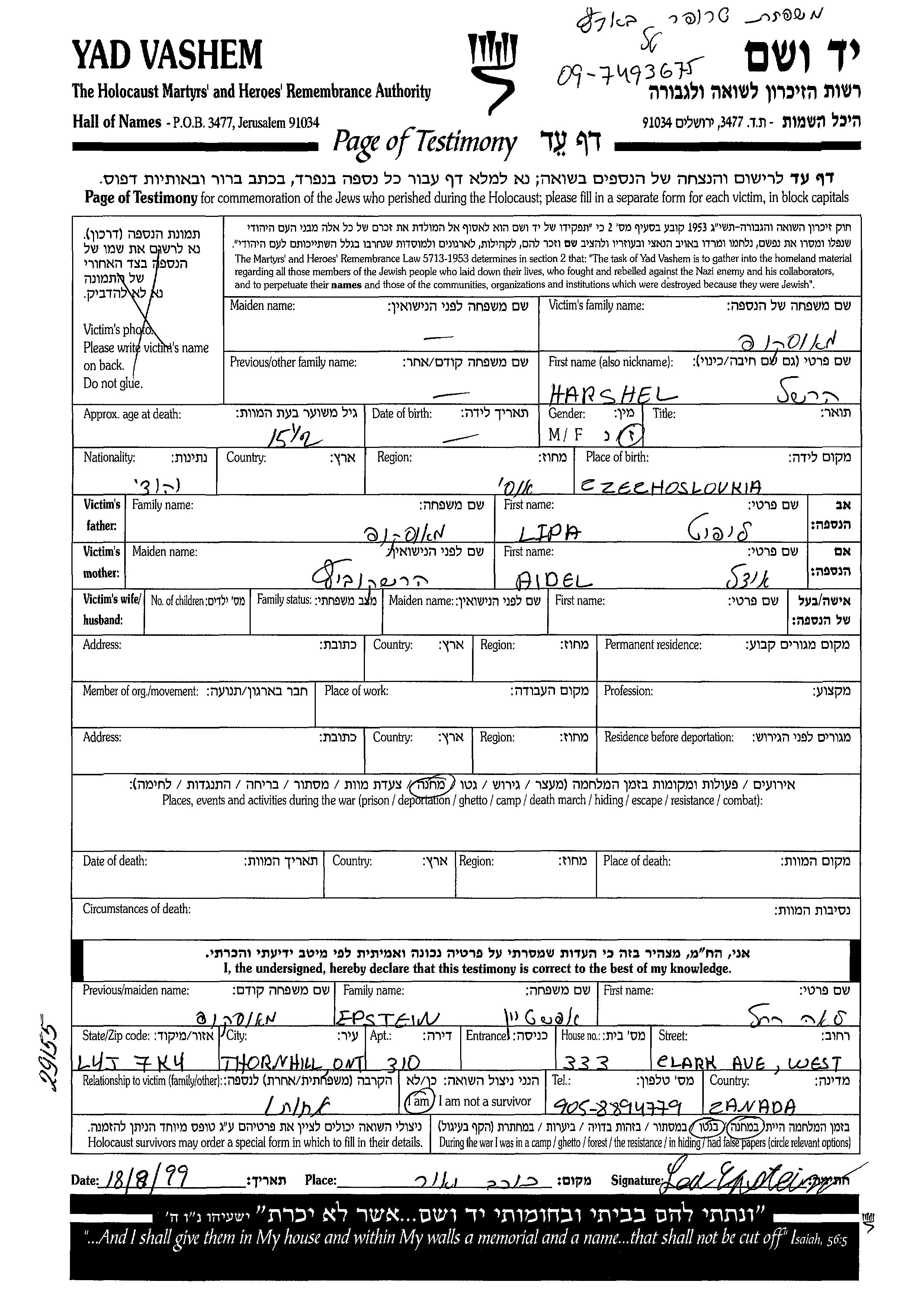 Harshel wurde in der Schoah ermordet.