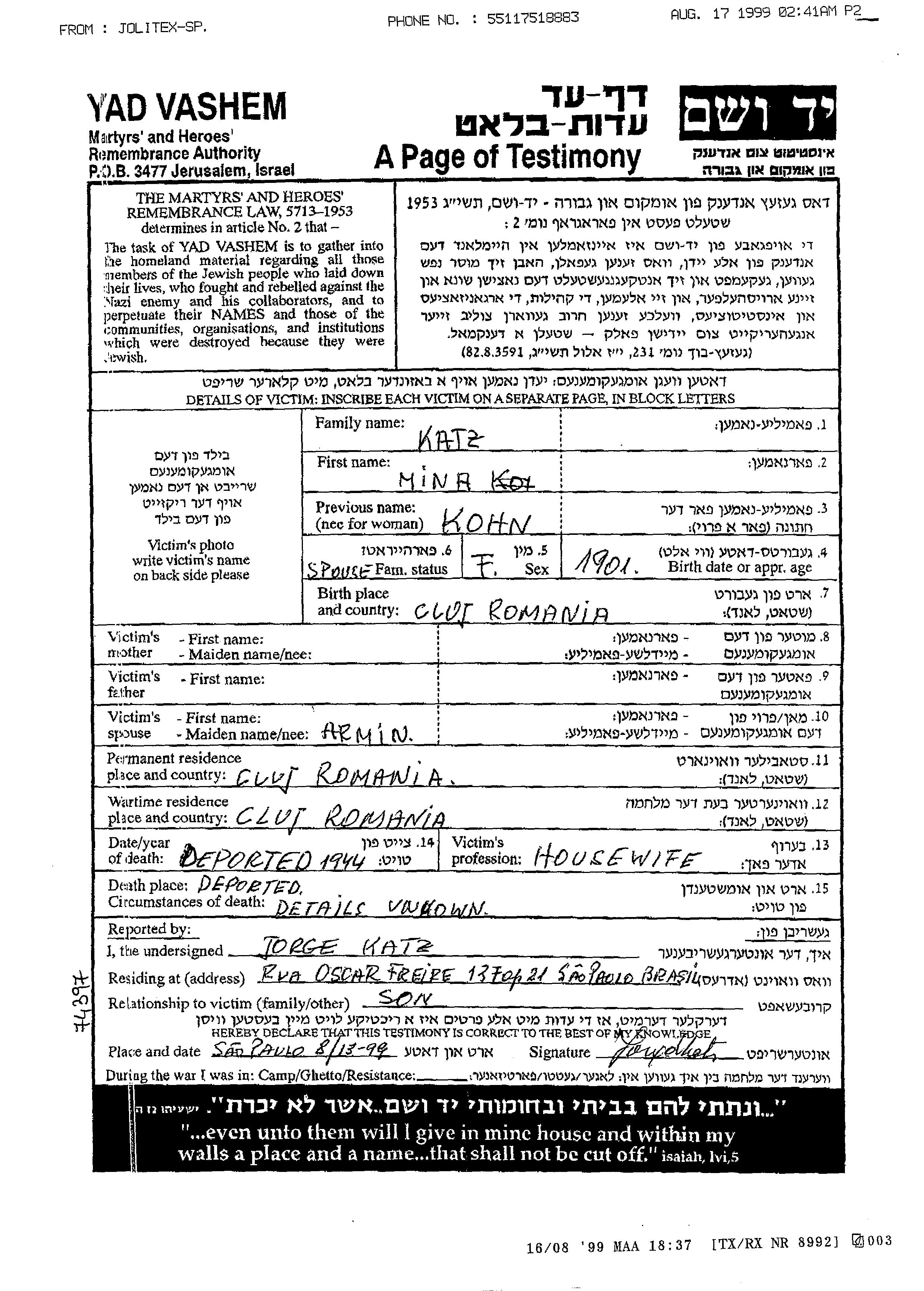 Mina Katz, geb. Kohn wurde im Jahr 1901 in Cluj, Rumänien geboren. Sie war Hausfrau und mit Armin Verheiratet. Vor dem Zweiten Weltkrieg lebte sie in Cluj, Rumänien. Während des Krieges war sie in Cluj, Rumänien.