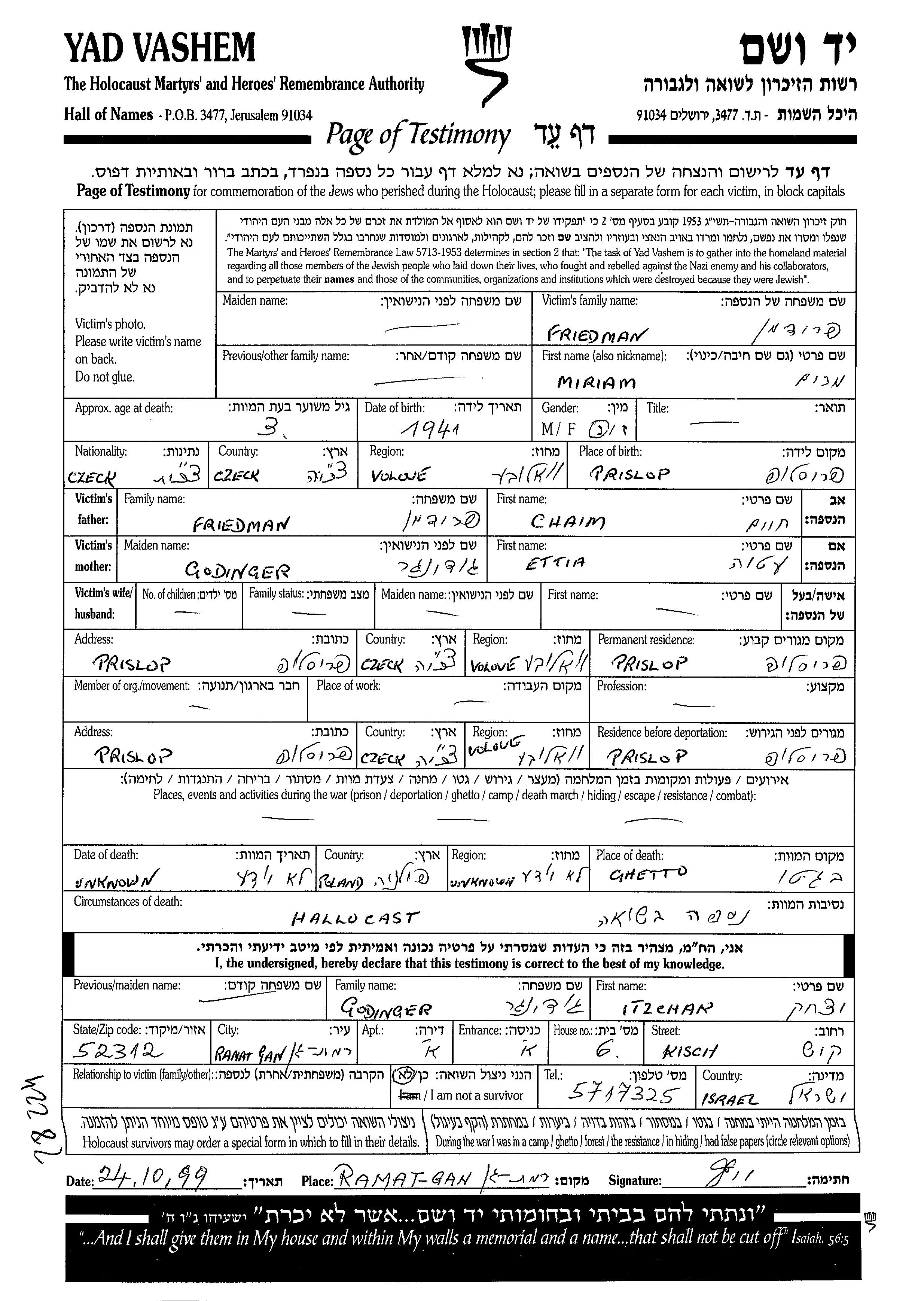 Friedman Miriam 1941 Prislop, Tschechoslowakei Gedenkblatt