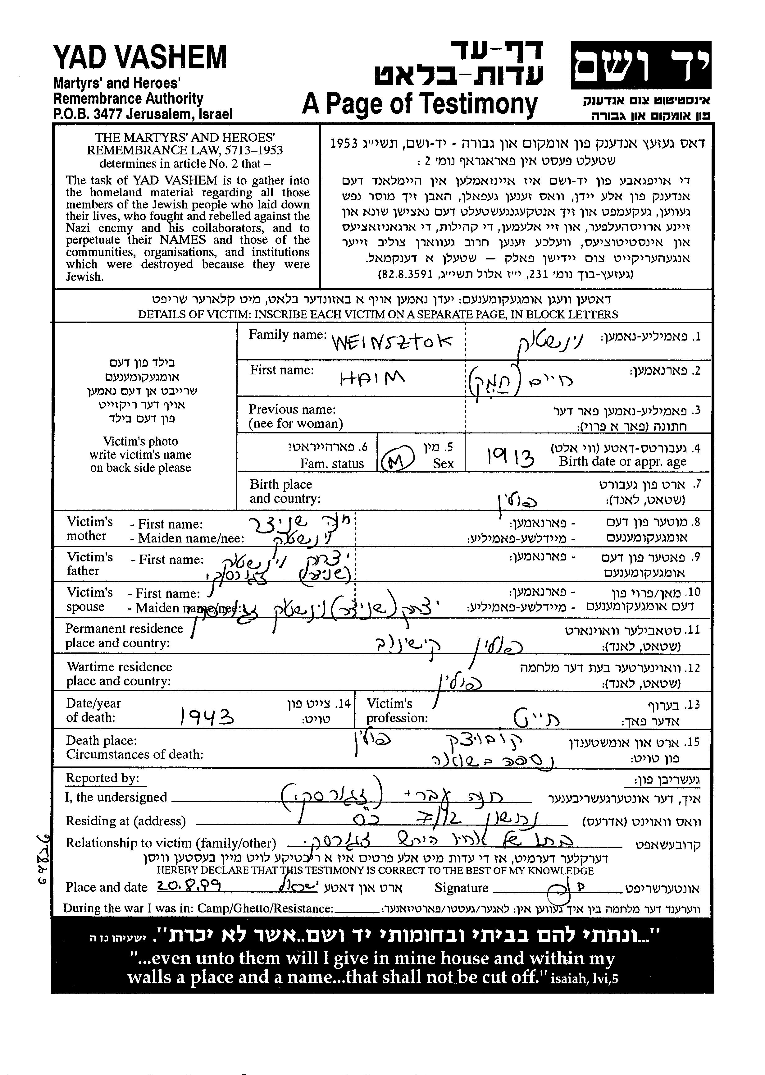 Haim Khemek Weinsztok Zagorski wurde im Jahr 1913 in Polen geboren. Er war der Sohn von Yitzkhak und Khana. Er war Schneider. Vor dem Zweiten Weltkrieg lebte er in Kszanow, Polen. Während des Krieges war er in Polen.