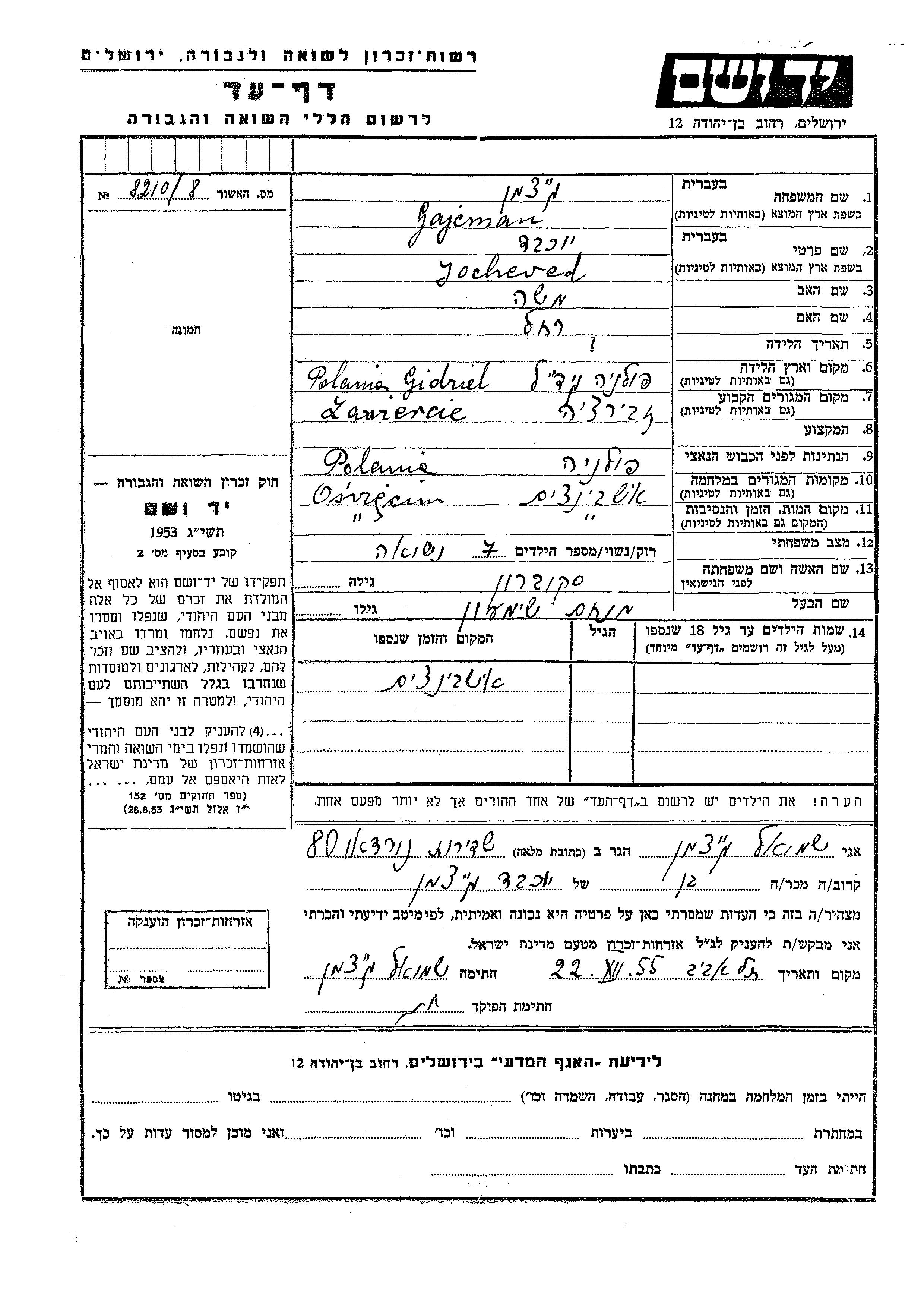 Gajcman Yocheved Zawiercie, Polen Gedenkblatt