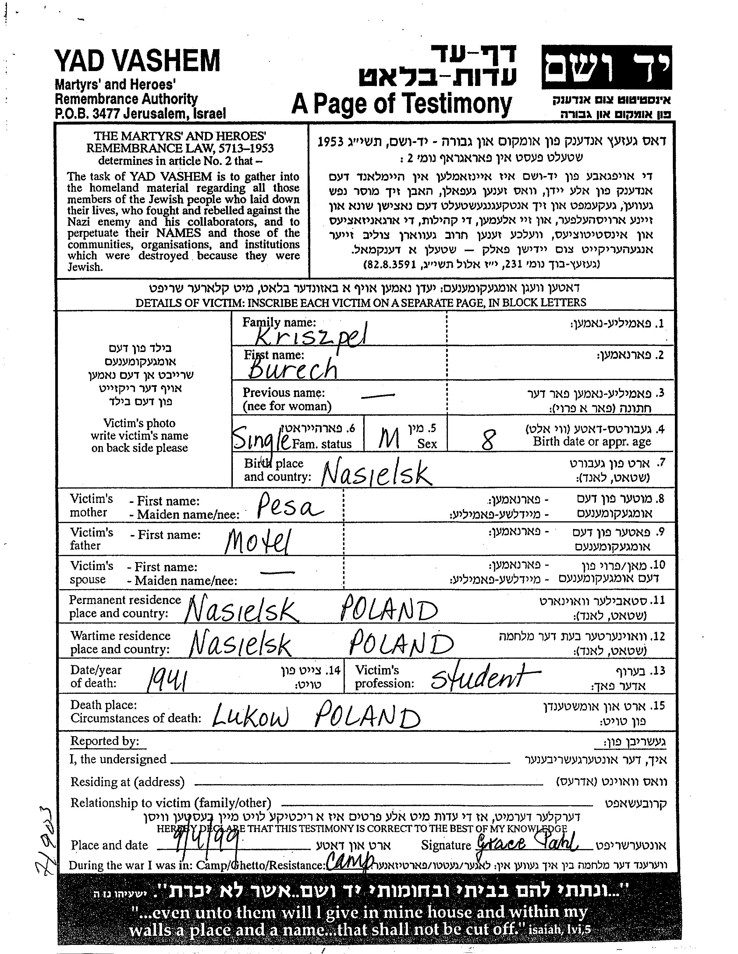 Burech Kriszpel wurde in Nasielsk, Polen geboren. Er war der Sohn von Motel und Pesa. Er war Student und Ledig. Vor dem Zweiten Weltkrieg lebte er in Nasielsk, Polen. Während des Krieges war er in Nasielsk, Polen.
