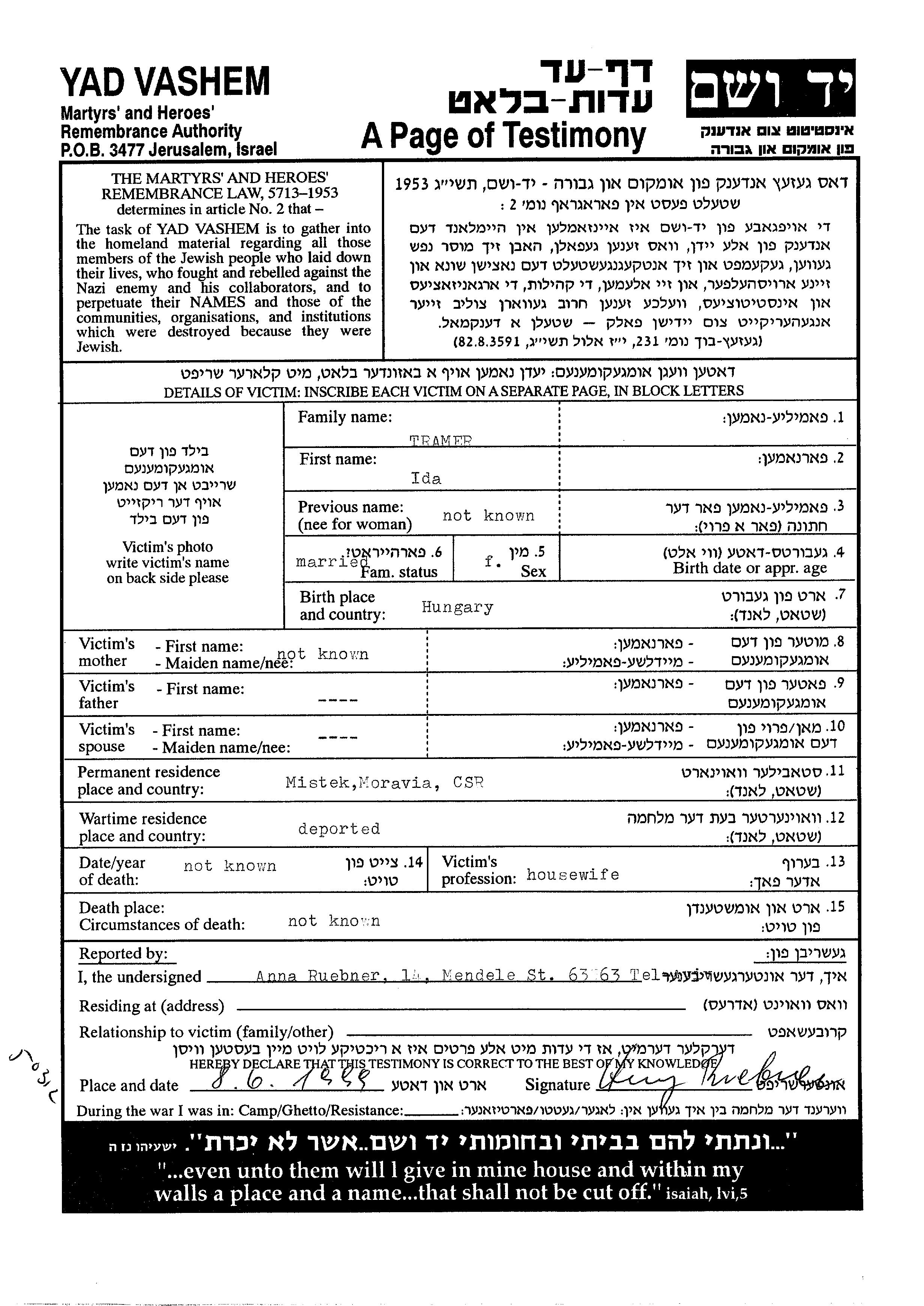 Ida Tramer wurde in Ungarn geboren. Sie war Verheiratet. Vor dem Zweiten Weltkrieg lebte sie in Mistek, Tschechoslowakei.