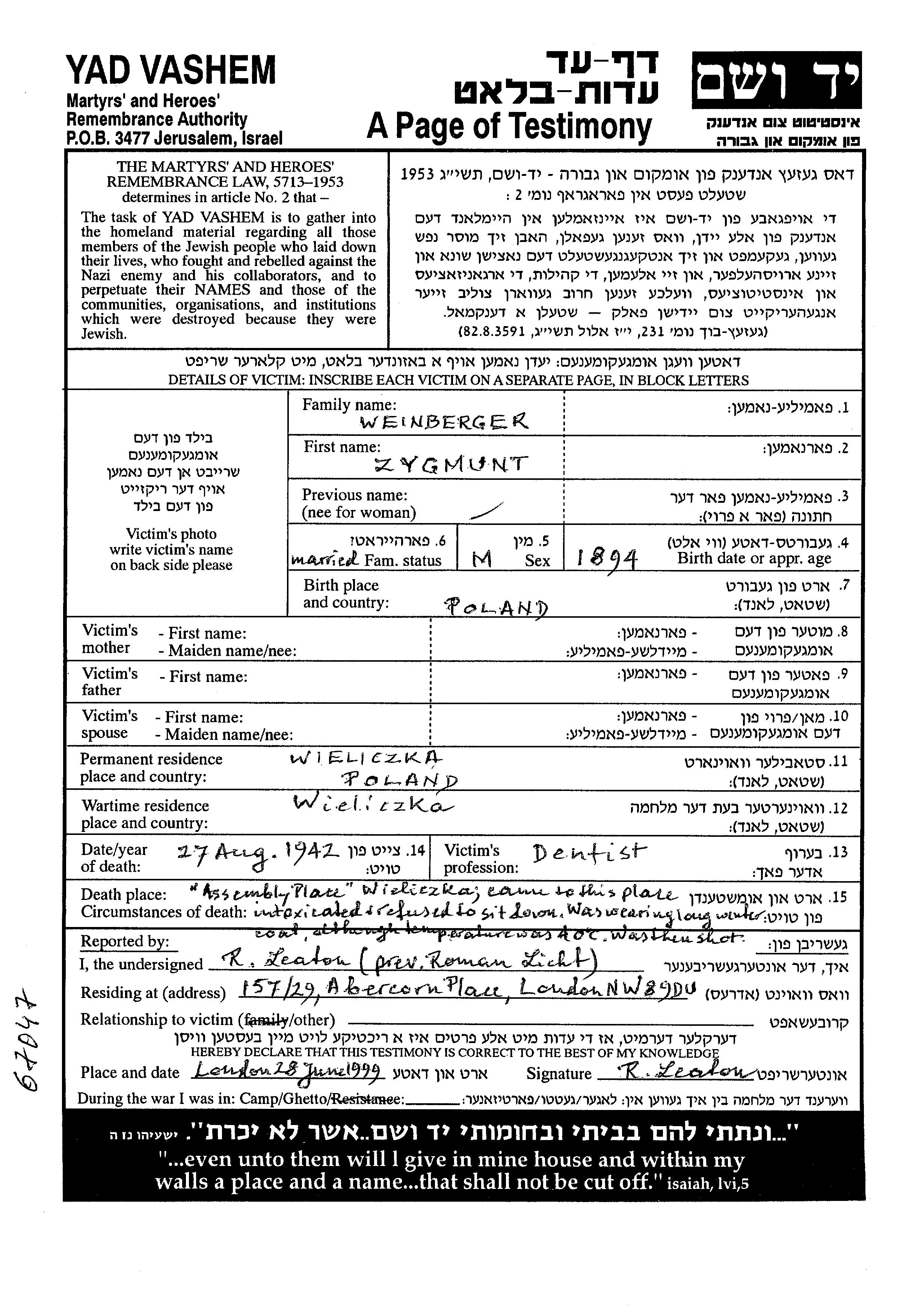 Zygmunt wurde in der Schoah ermordet. Todesort: Wieliczka, Polen im Jahr 1942.