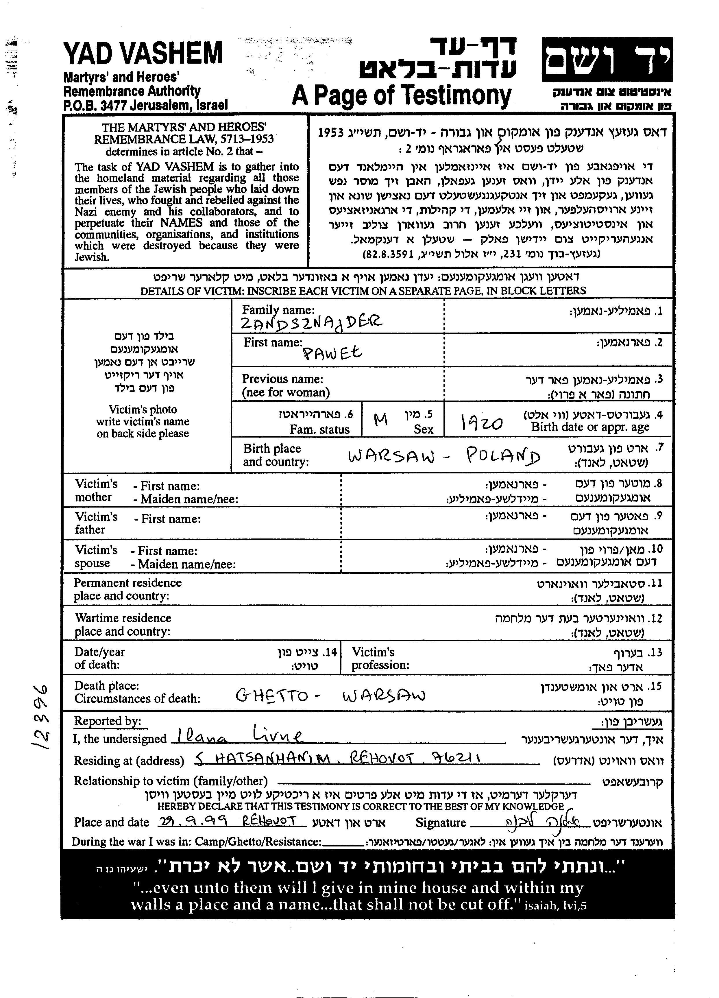 Zandsznajder Pawel 1920 unbekannter Ort, Gedenkblatt