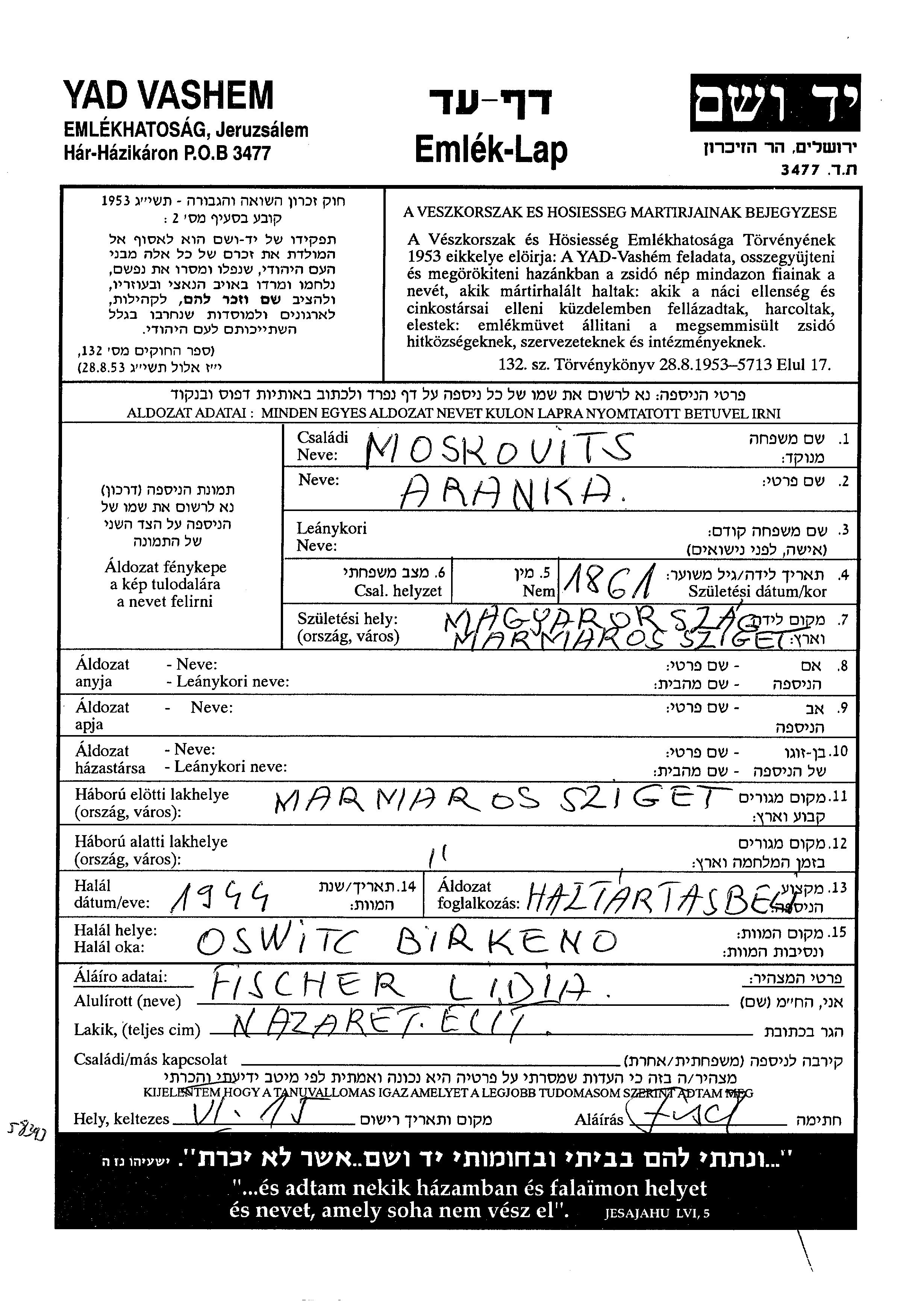 Aranka Moskovits wurde im Jahr 1861 in Marmaros Sighet, Rumänien geboren. Sie war Hausfrau. Vor dem Zweiten Weltkrieg lebte sie in Marmaros Sighet, Rumänien.