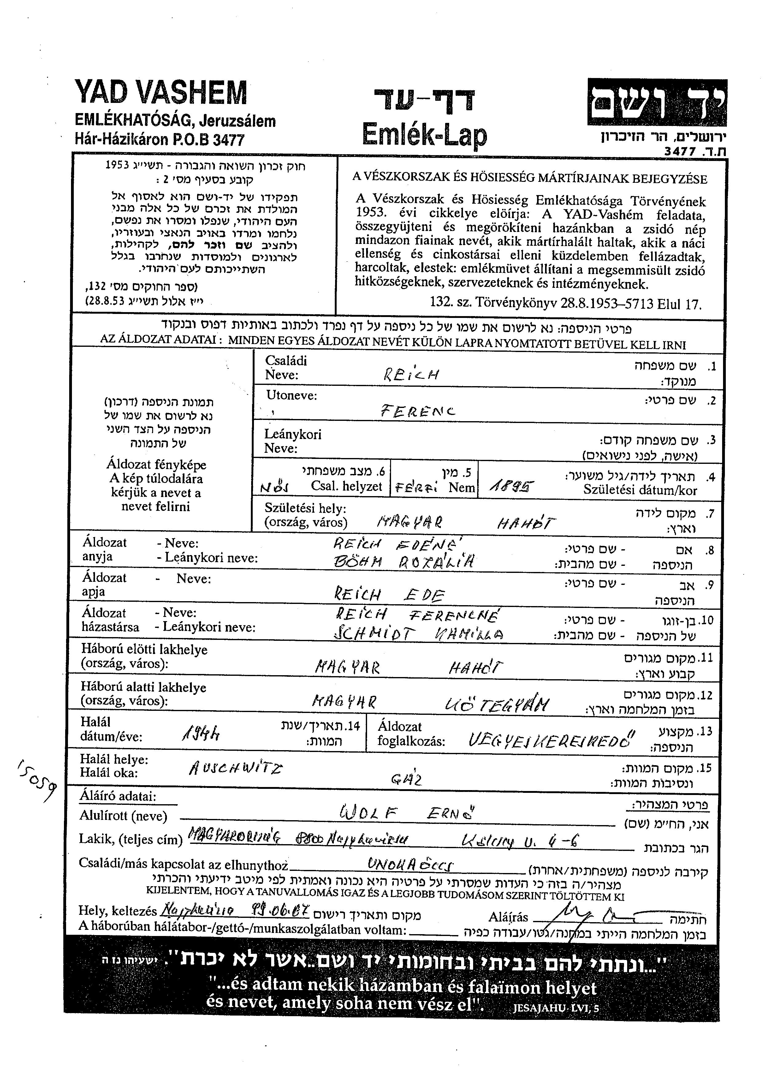 Ferentz Reich wurde im Jahr 1895 in Hahot, Ungarn geboren. Er war der Sohn von Ede und Rozalia. Er war Vegyeskereskedo und mit Kamilla, geb. Schmidt Verheiratet. Vor dem Zweiten Weltkrieg lebte er in Hahot, Ungarn. Während des Krieges war er in Kotegyan, Ungarn.