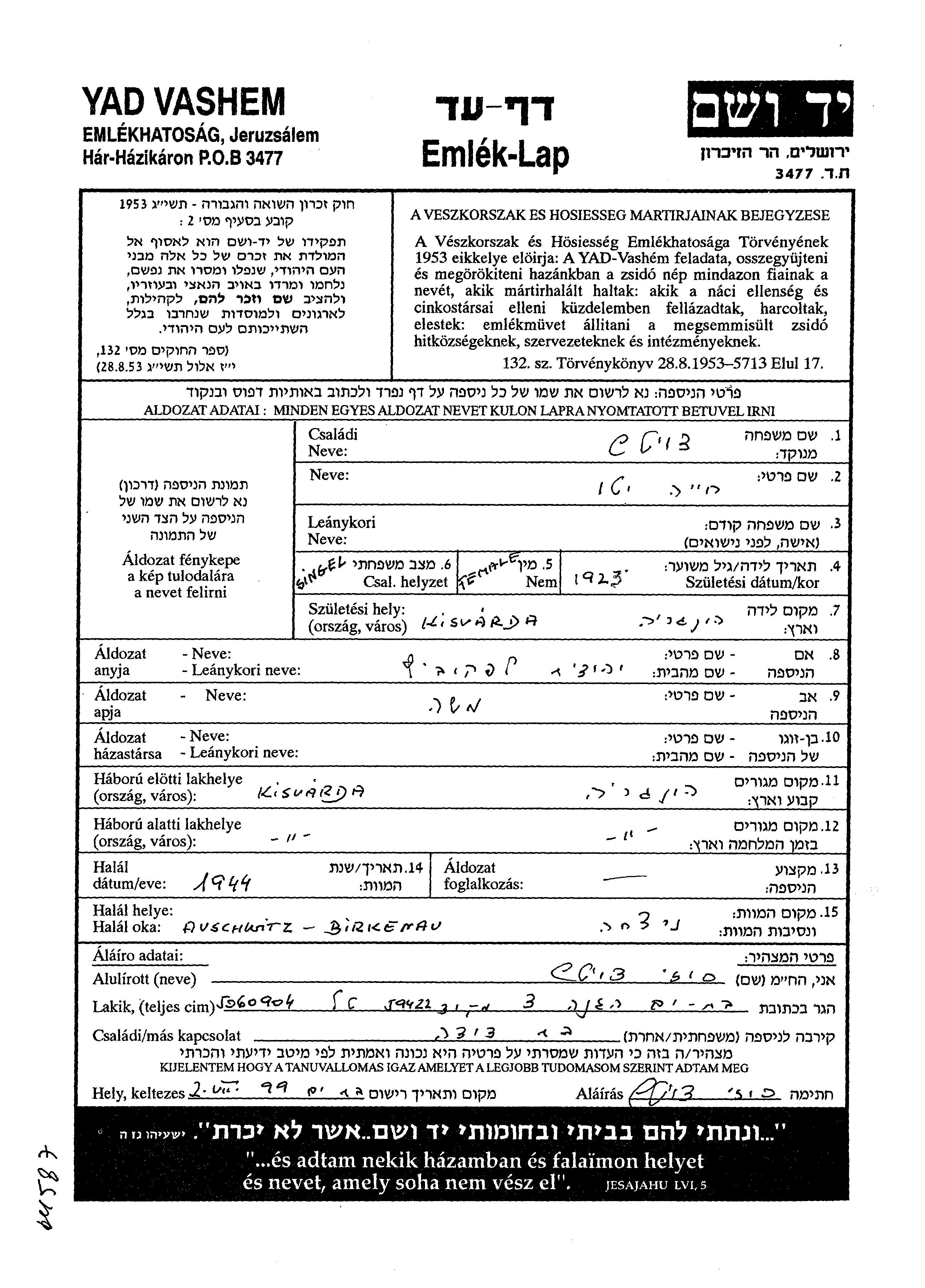 Khaia Etu Deutsch wurde im Jahr 1923 in Kisvarda, Ungarn geboren. Sie war die Tochter von Moshe und Yehudit. Sie war Ledig. Vor dem Zweiten Weltkrieg lebte sie in Kisvarda, Ungarn. Während des Krieges war sie in Kisvarda, Ungarn.