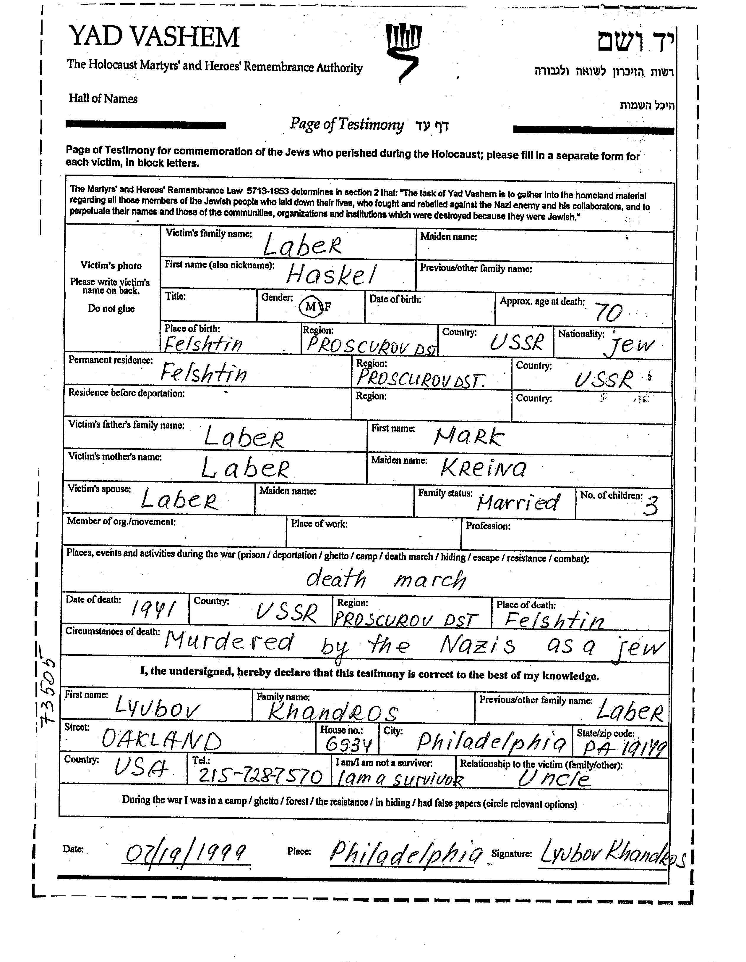 Haskel Laber wurde in Felshtin, Ukraine (UdSSR) geboren. Er war der Sohn von Mark und Kreina. Er war Verheiratet. Vor dem Zweiten Weltkrieg lebte er in Felshtin, Ukraine (UdSSR). Während des Krieges war er in Felshtin, Ukraine (UdSSR).