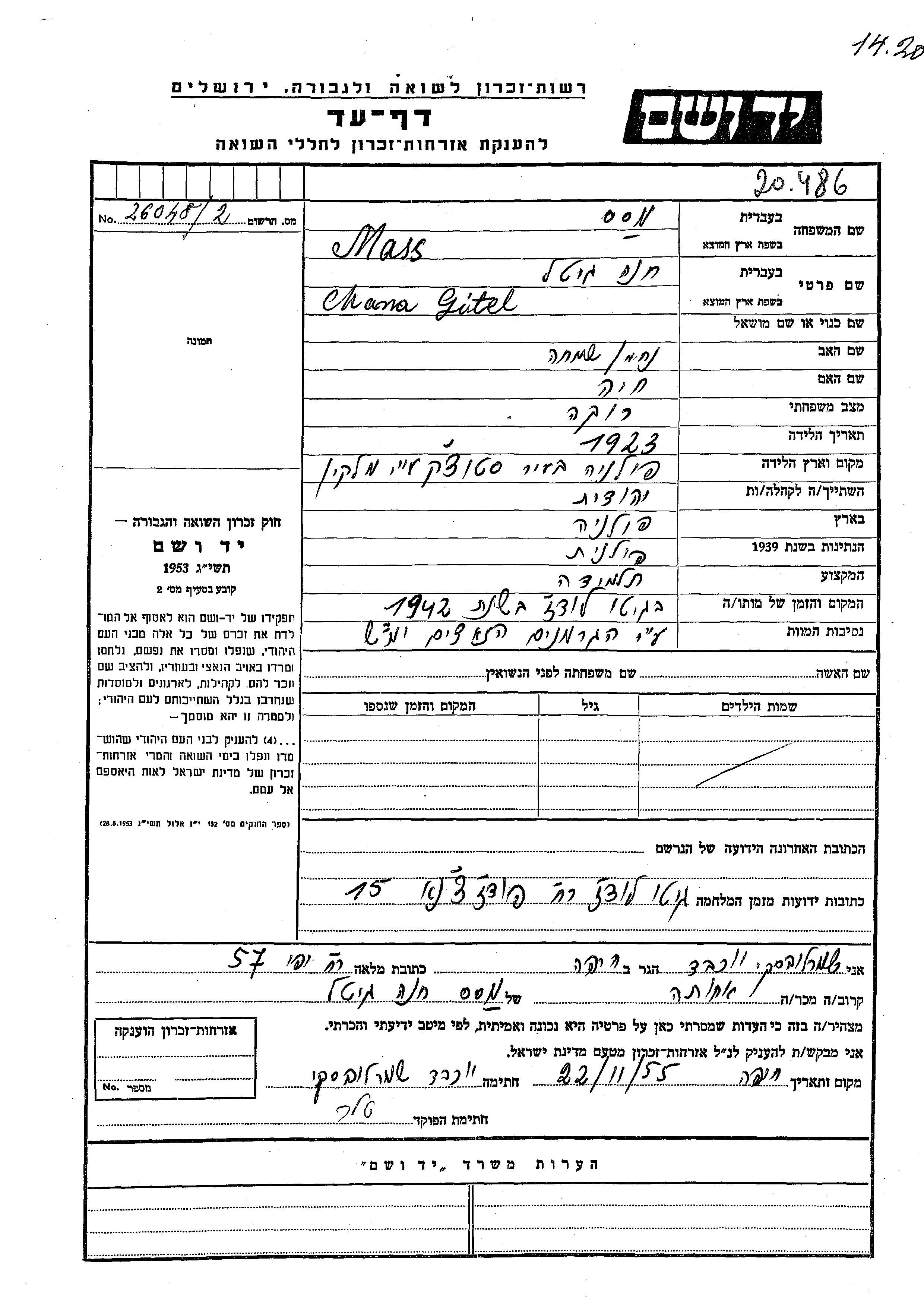 Hana Gitel Mass Mases wurde im Jahr 1923 in Stoczek, Polen geboren. Sie war die Tochter von Nakhman Simkha und Khaia. Sie war Schüler/-in und Ledig. Während des Krieges war sie in Lodz, Polen.