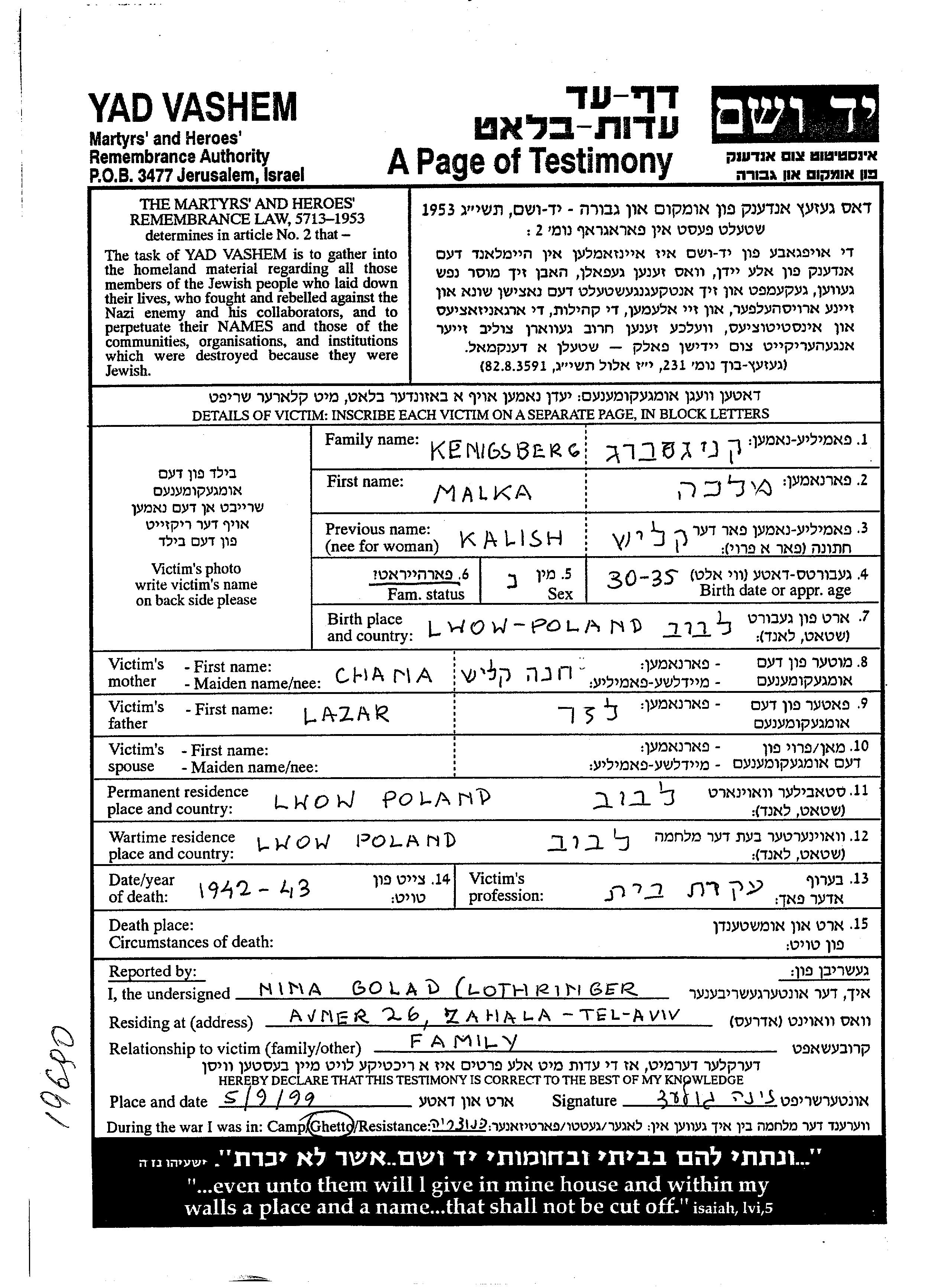 Malka Kenigsberg, geb. Klish wurde in Lwow, Polen geboren. Sie war die Tochter von Lazar und Chana. Sie war Hausfrau und Verheiratet. Vor dem Zweiten Weltkrieg lebte sie in Lwow, Polen. Während des Krieges war sie in Lwow, Polen.