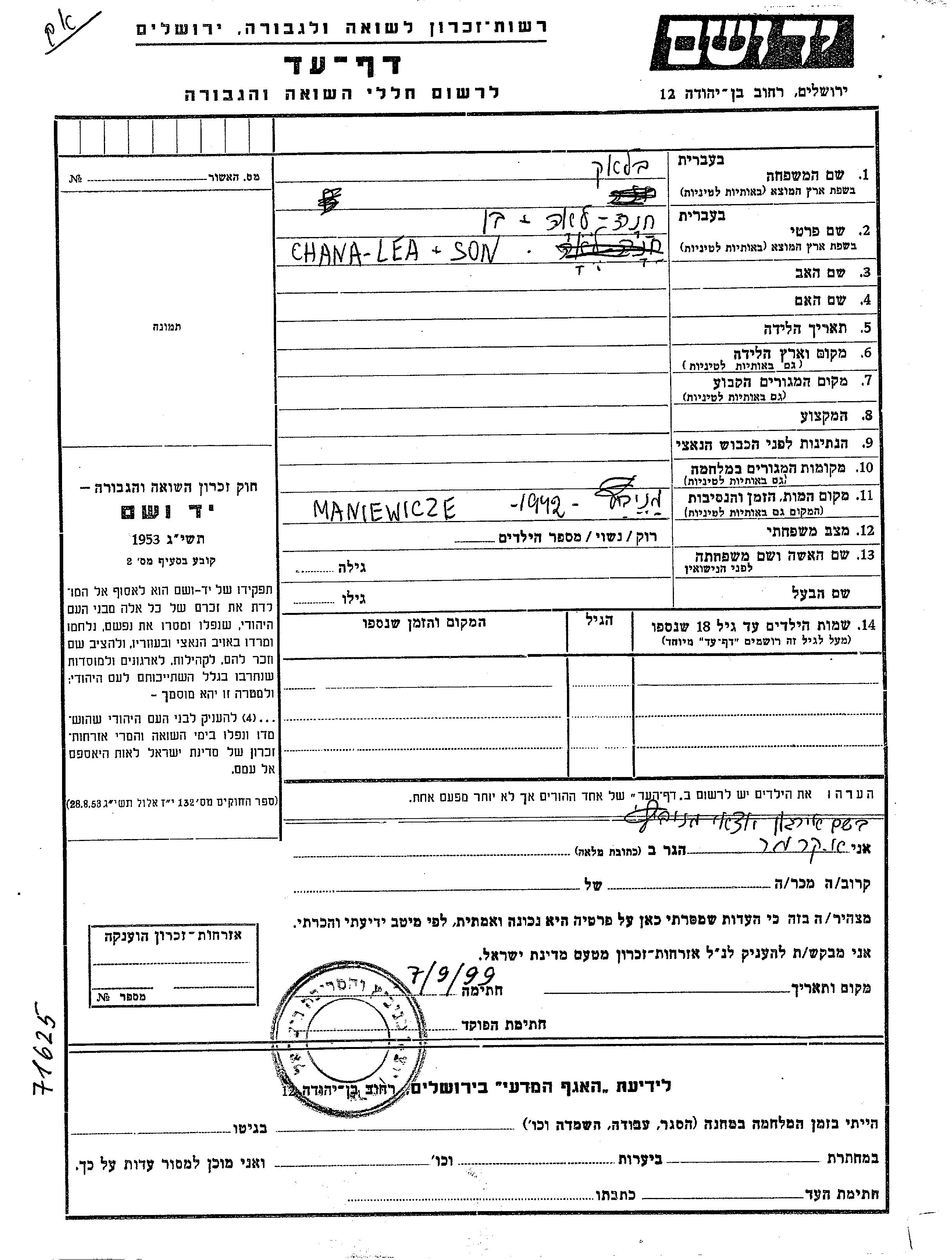 Chana Lea wurde in der Schoah ermordet. Todesort: Maniewicze, Polen im Jahr 1942.