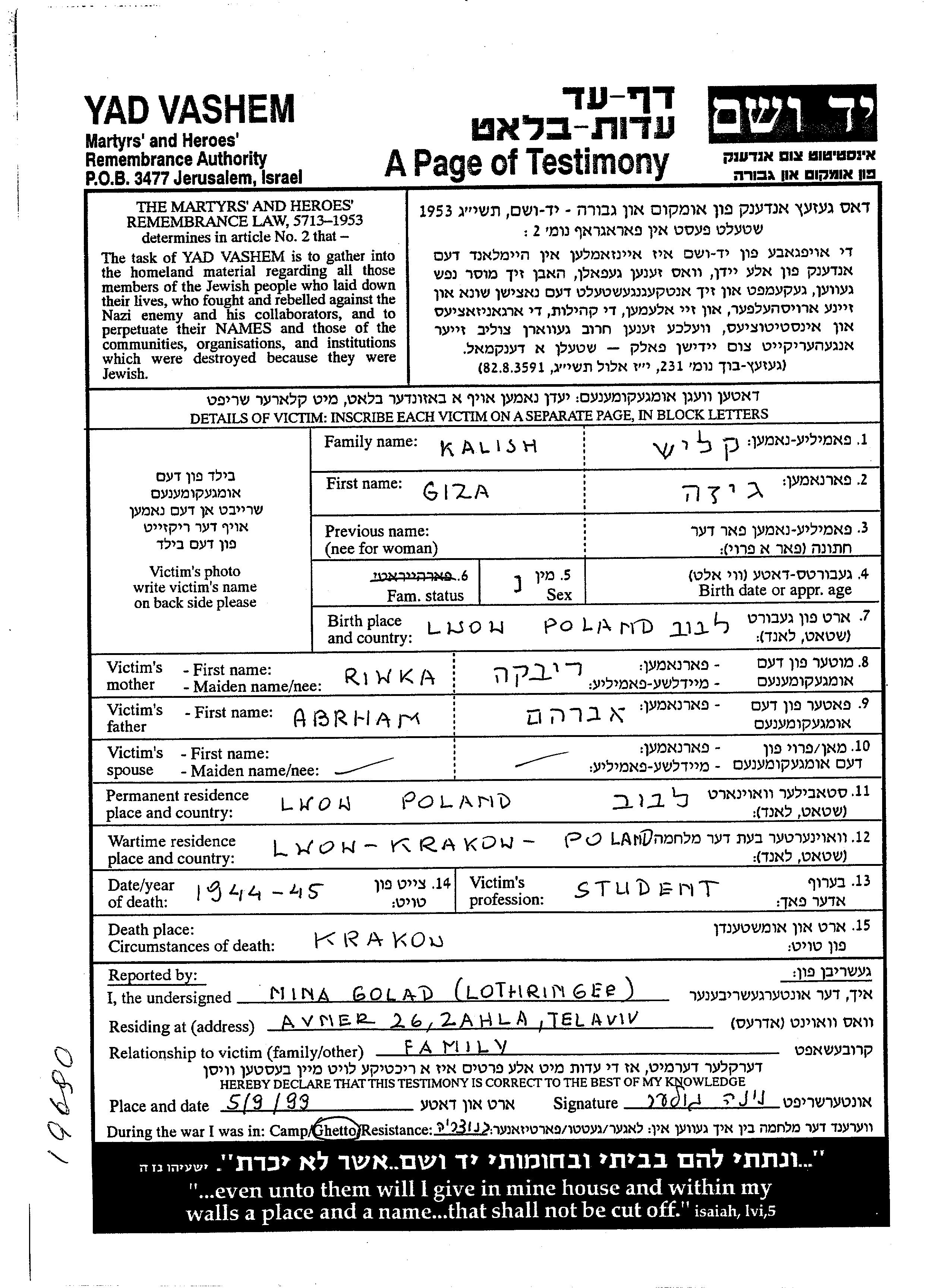 Giza Kalish wurde in Lwow, Polen geboren. Sie war die Tochter von Abrham und Riwka. Sie war Student und Ledig. Vor dem Zweiten Weltkrieg lebte sie in Lwow, Polen. Während des Krieges war sie in Lwow, Polen.