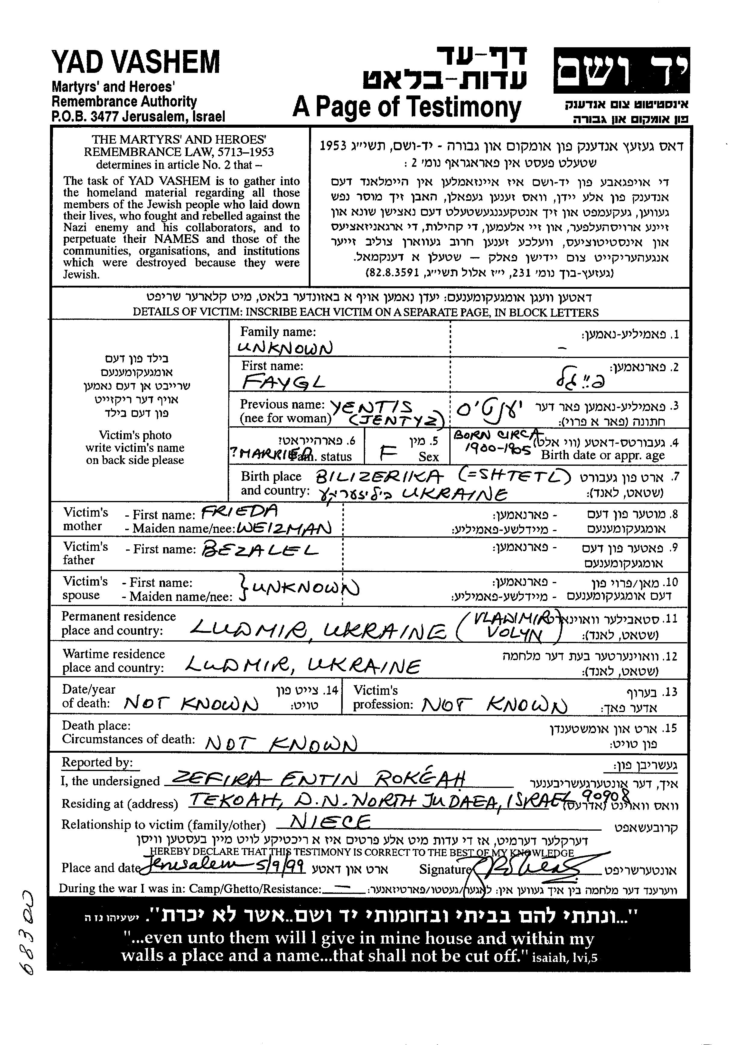 Faygl Name unbekannt, geb. Yentis wurde im Jahr 1900 in Bilizerka, Polen geboren. Sie war die Tochter von Bezalel und Frieda. Sie war Verheiratet. Vor dem Zweiten Weltkrieg lebte sie in Ludmir, Polen. Während des Krieges war sie in Ludmir, Polen.