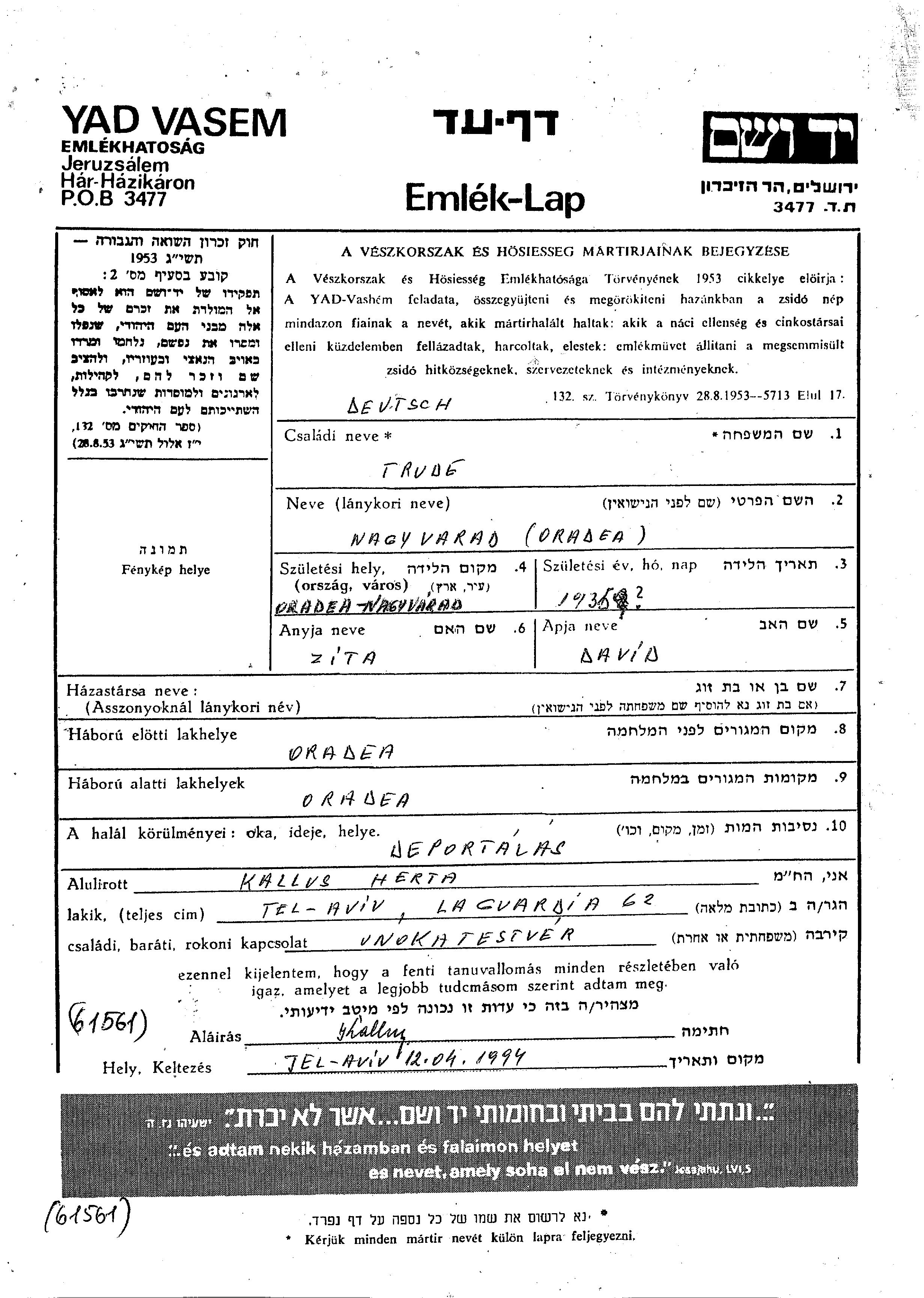 Trude Deutsch wurde im Jahr 1935 in Oradea, Rumänien geboren. Sie war die Tochter von David und Zita. Vor dem Zweiten Weltkrieg lebte sie in Oradea, Rumänien. Während des Krieges war sie in Oradea, Rumänien.