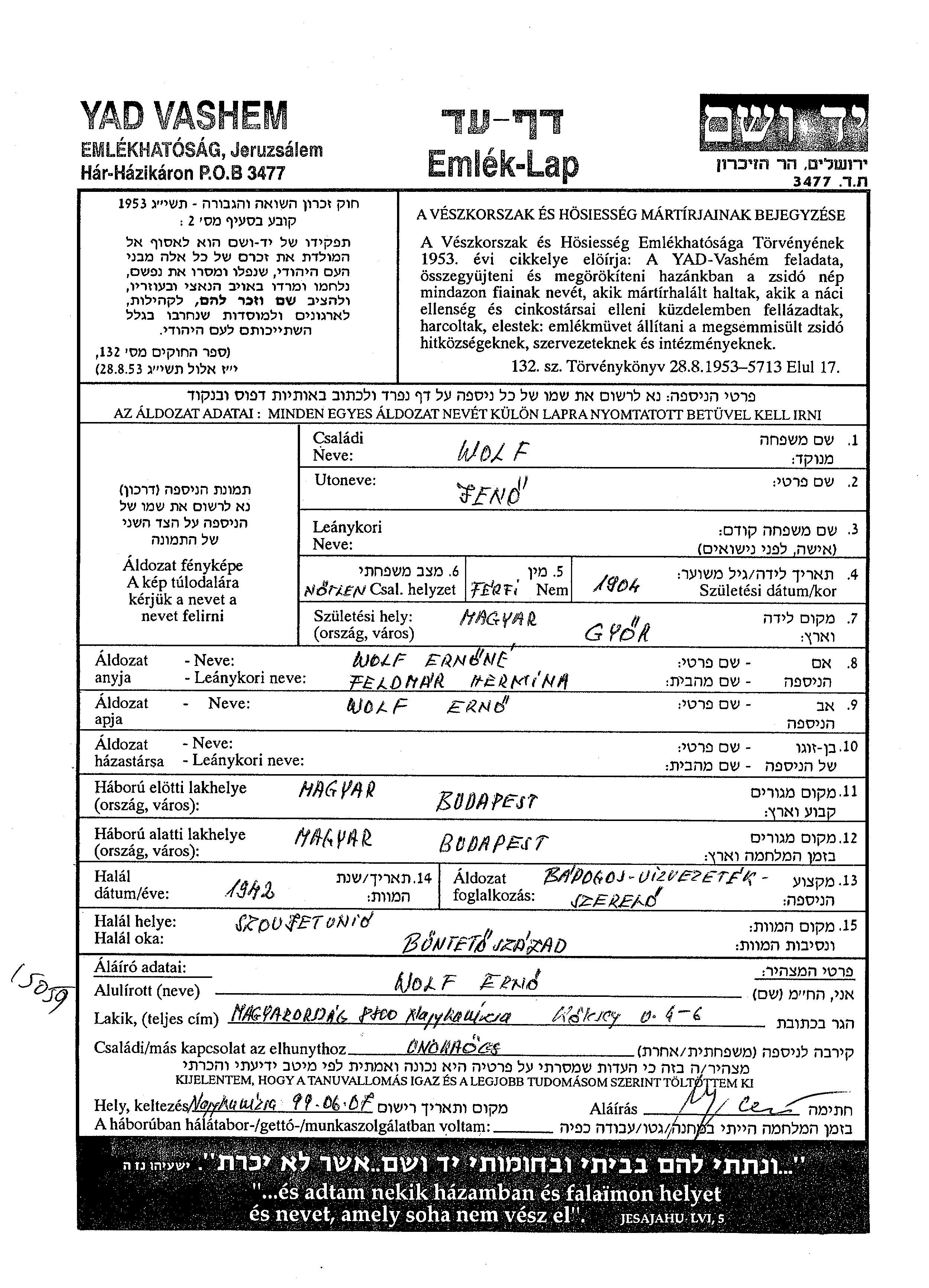 Jeno Wolf wurde im Jahr 1904 in Gyor, Ungarn geboren. Er war der Sohn von Erno und Hermina. Er war Blechschmied und Ledig. Vor dem Zweiten Weltkrieg lebte er in Budapest, Ungarn. Während des Krieges war er in Budapest, Ungarn.