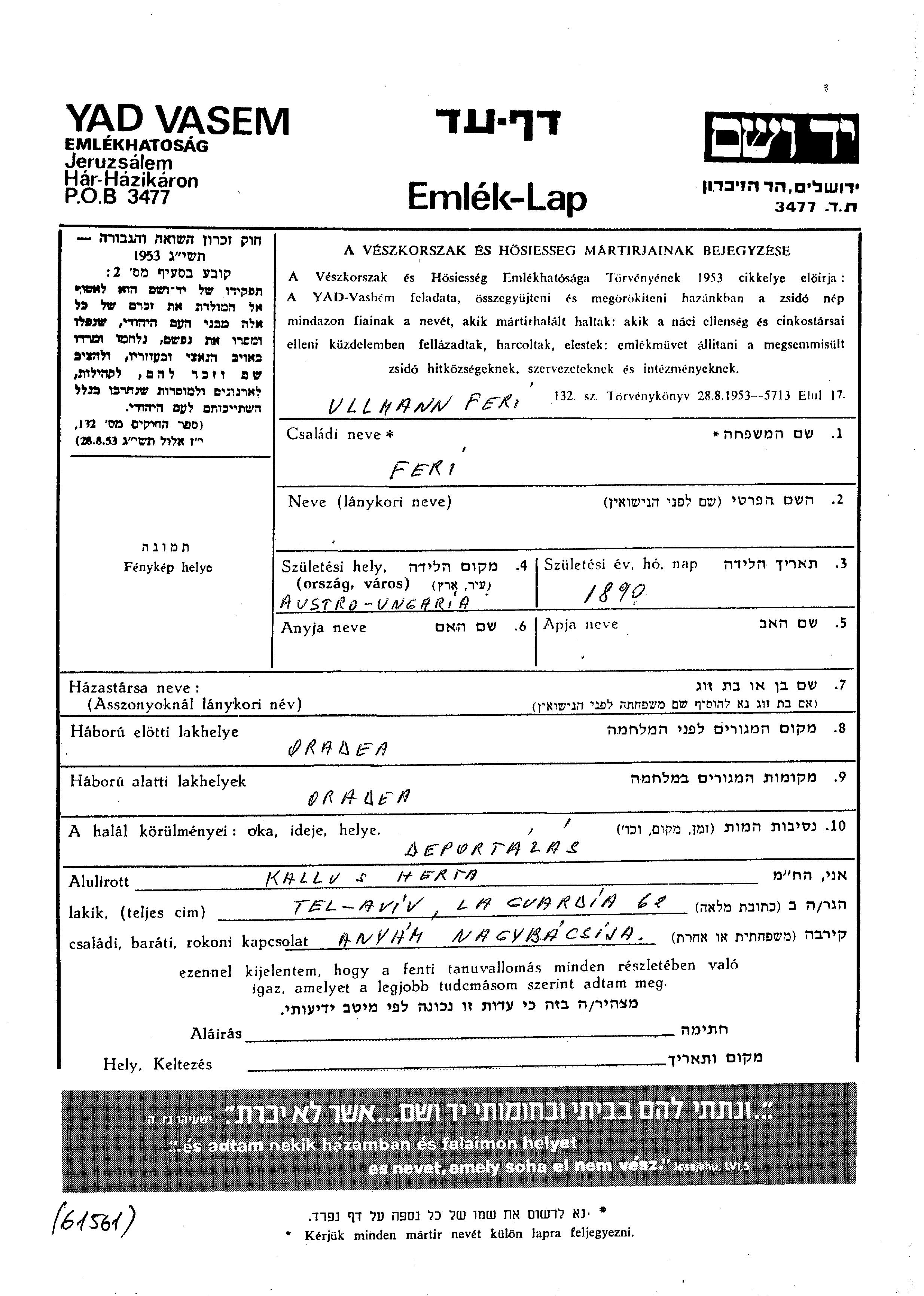 Feri Ullmann wurde im Jahr 1890 in Österreich-Ungarn geboren. Vor dem Zweiten Weltkrieg lebte er in Oradea, Rumänien. Während des Krieges war er in Oradea, Rumänien.