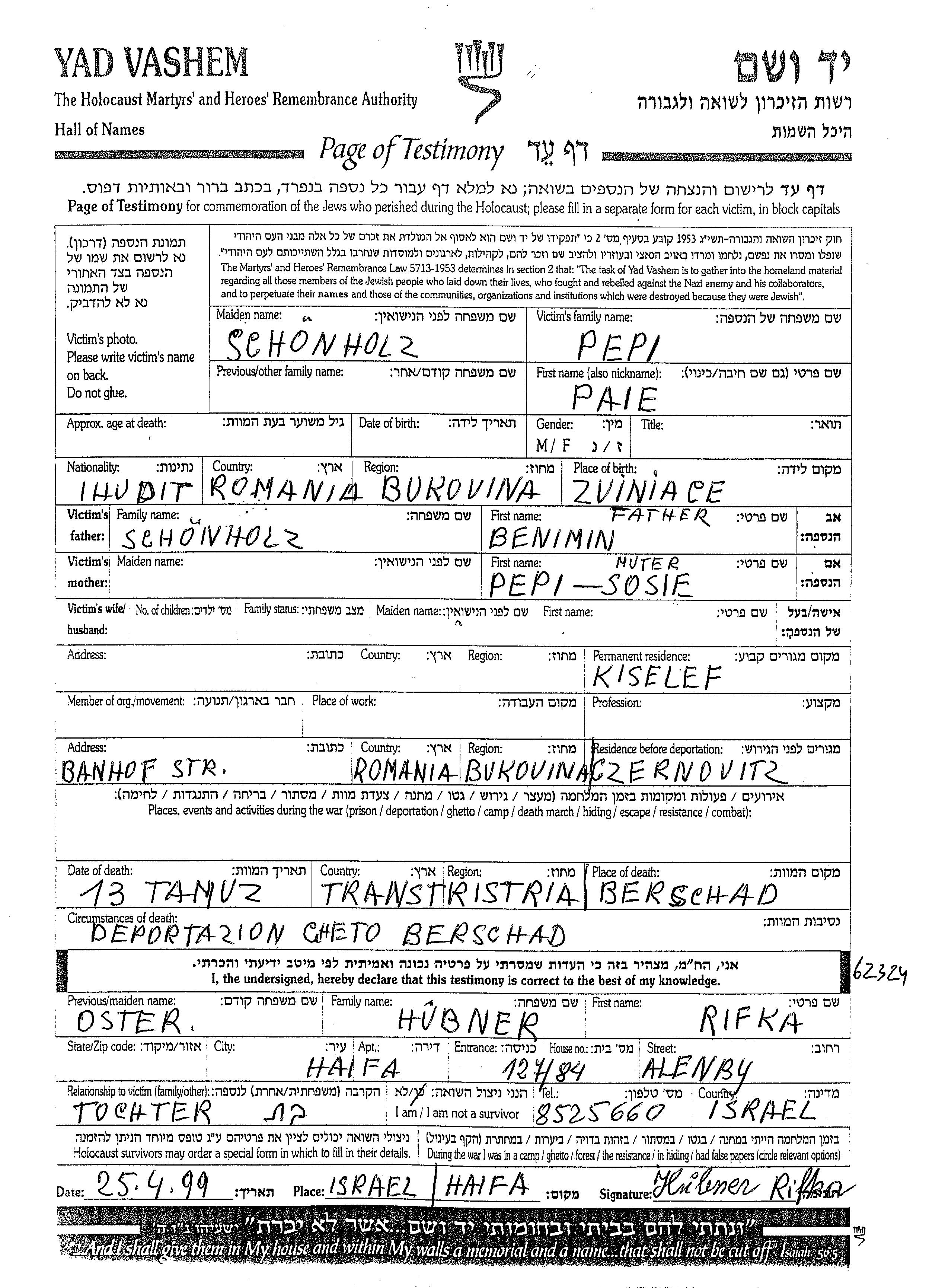 Paie Pepi, geb. Schönholz wurde in Zviniace, Rumänien geboren. Sie war die Tochter von Benimin und Sosie. Vor dem Zweiten Weltkrieg lebte sie in Kiselev, Rumänien. Während des Krieges war sie in Czernowitz, Rumänien.