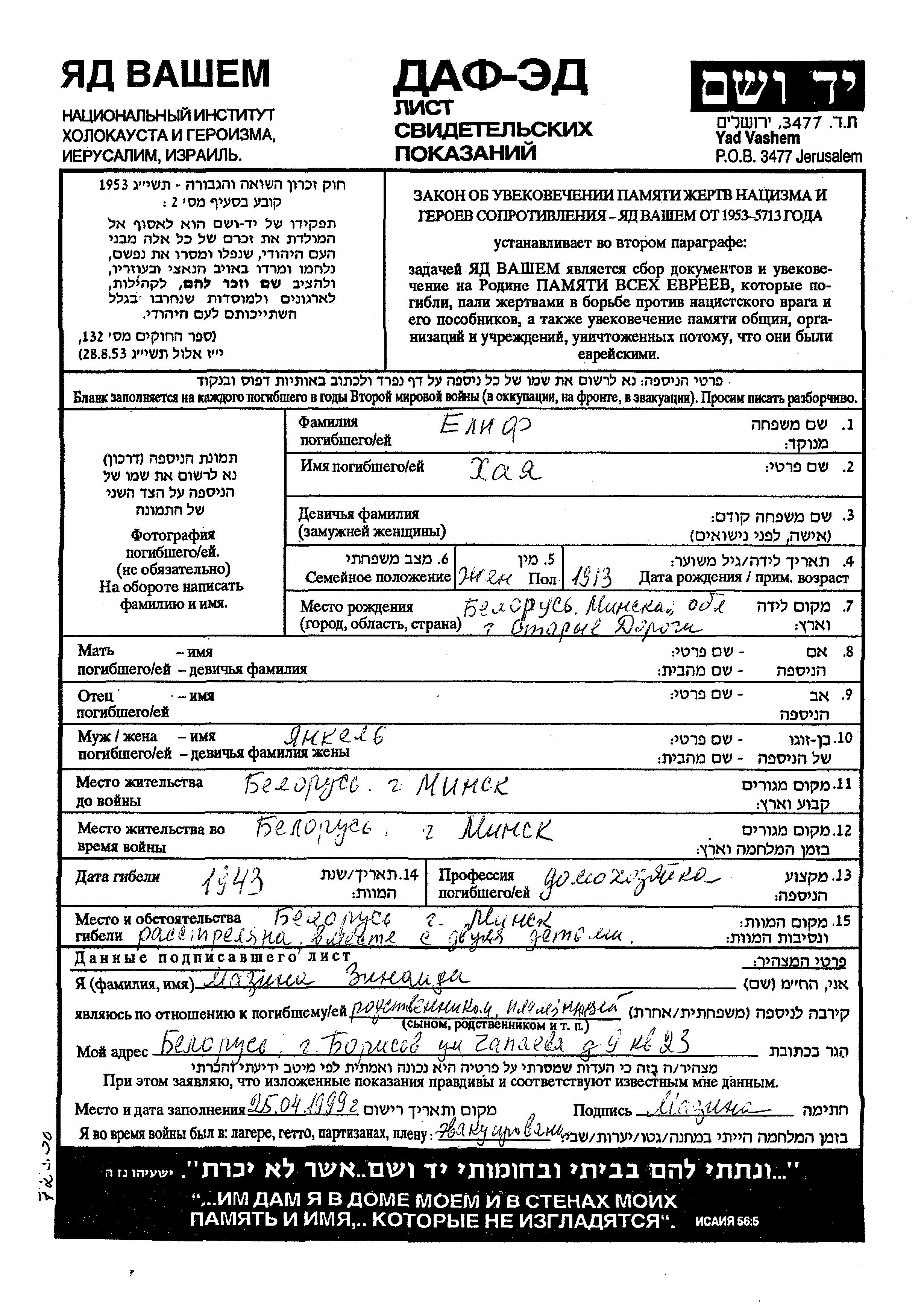 Khaia Elif wurde im Jahr 1913 in Staryye Dorogi, Weißrussland (UdSSR) geboren. Sie war Hausfrau. Vor dem Zweiten Weltkrieg lebte sie in Minsk, Weißrussland (UdSSR). Während des Krieges war sie in Minsk, Weißrussland (UdSSR).