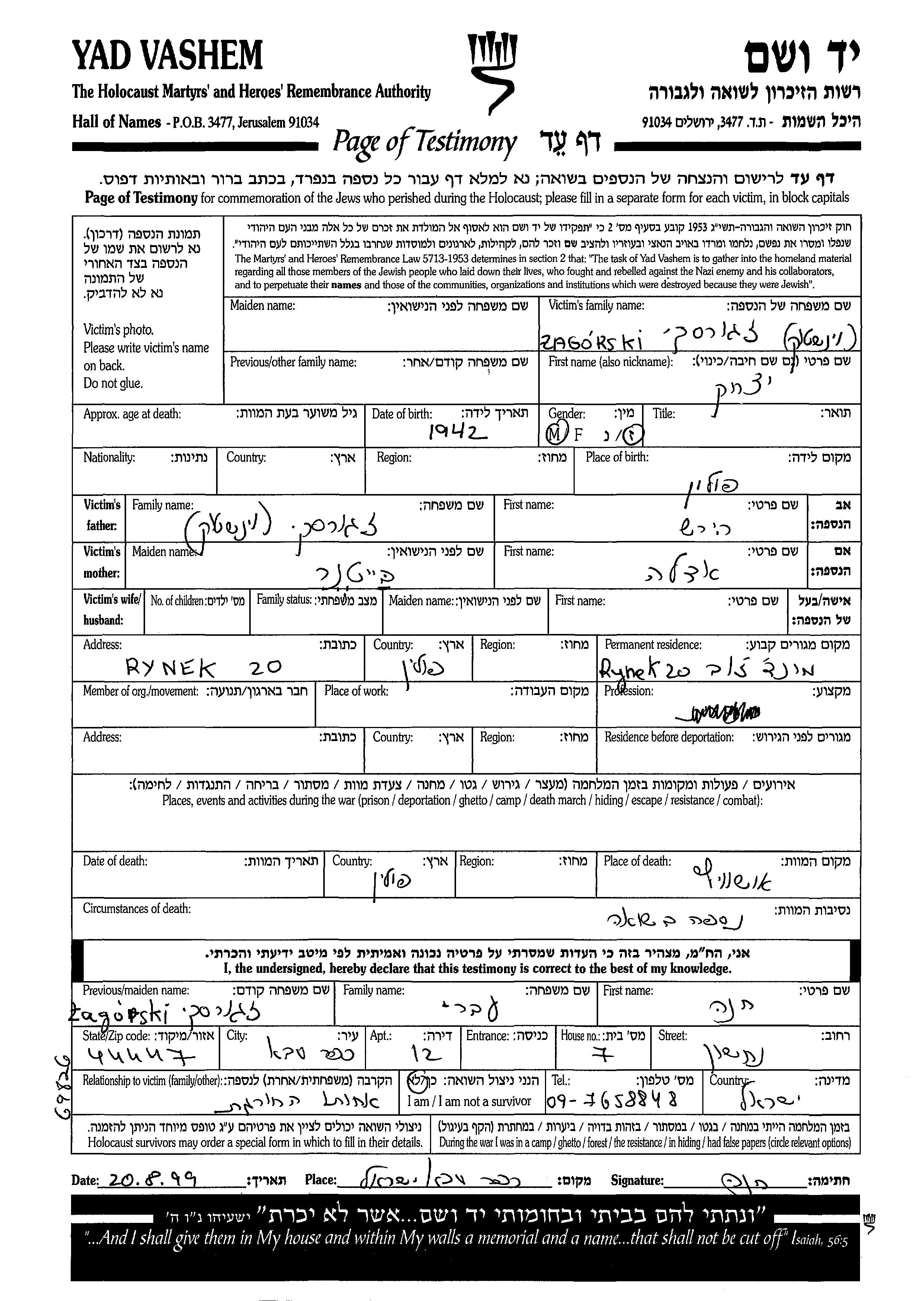 Yitzkhak wurde in der Schoah ermordet. Todesort: Auschwitz, Polen.