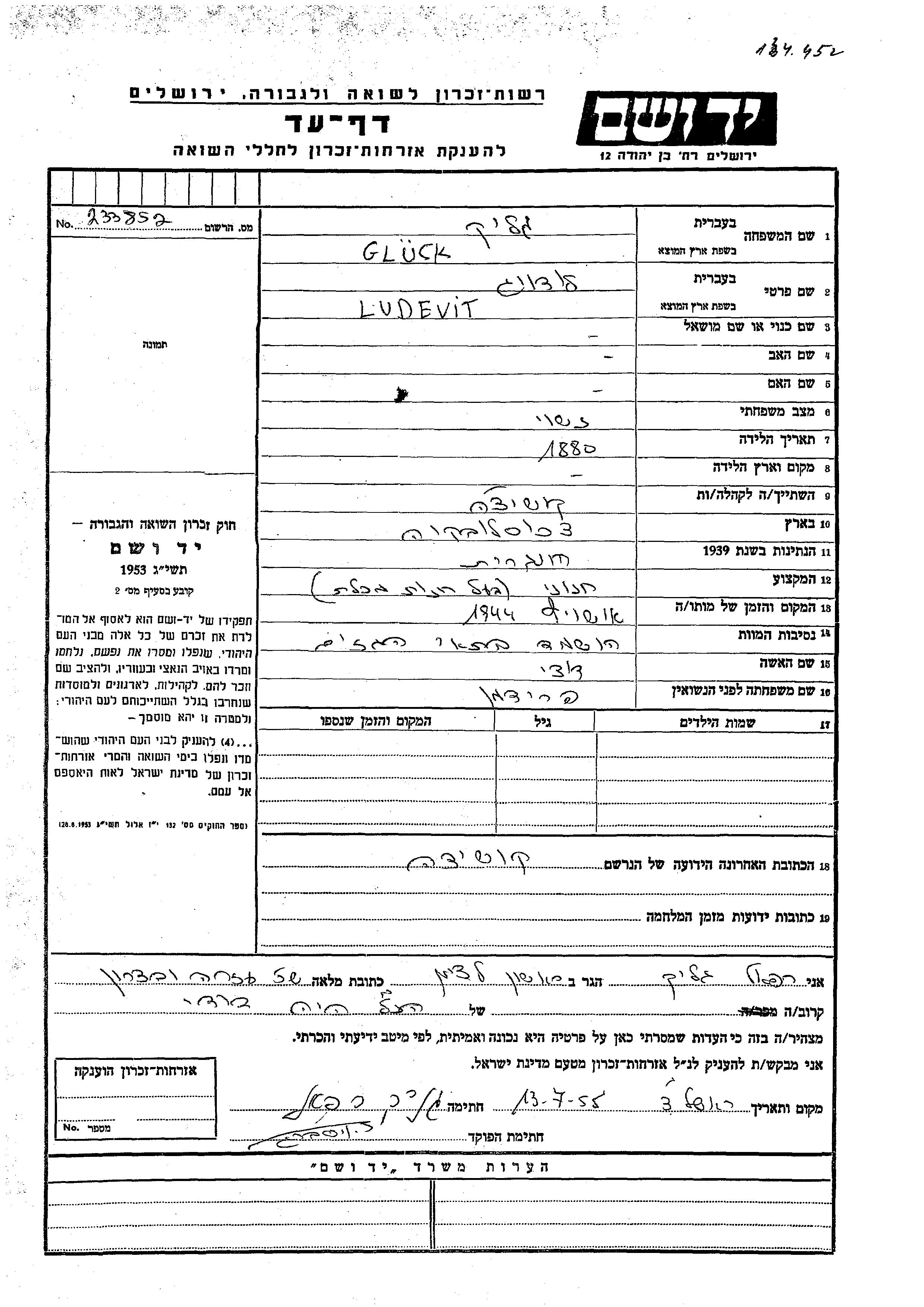 Ludvig Glück wurde im Jahr 1880 geboren. Er war Lebensmittelhändler/-in. Während des Krieges war er in Tschechoslowakei.