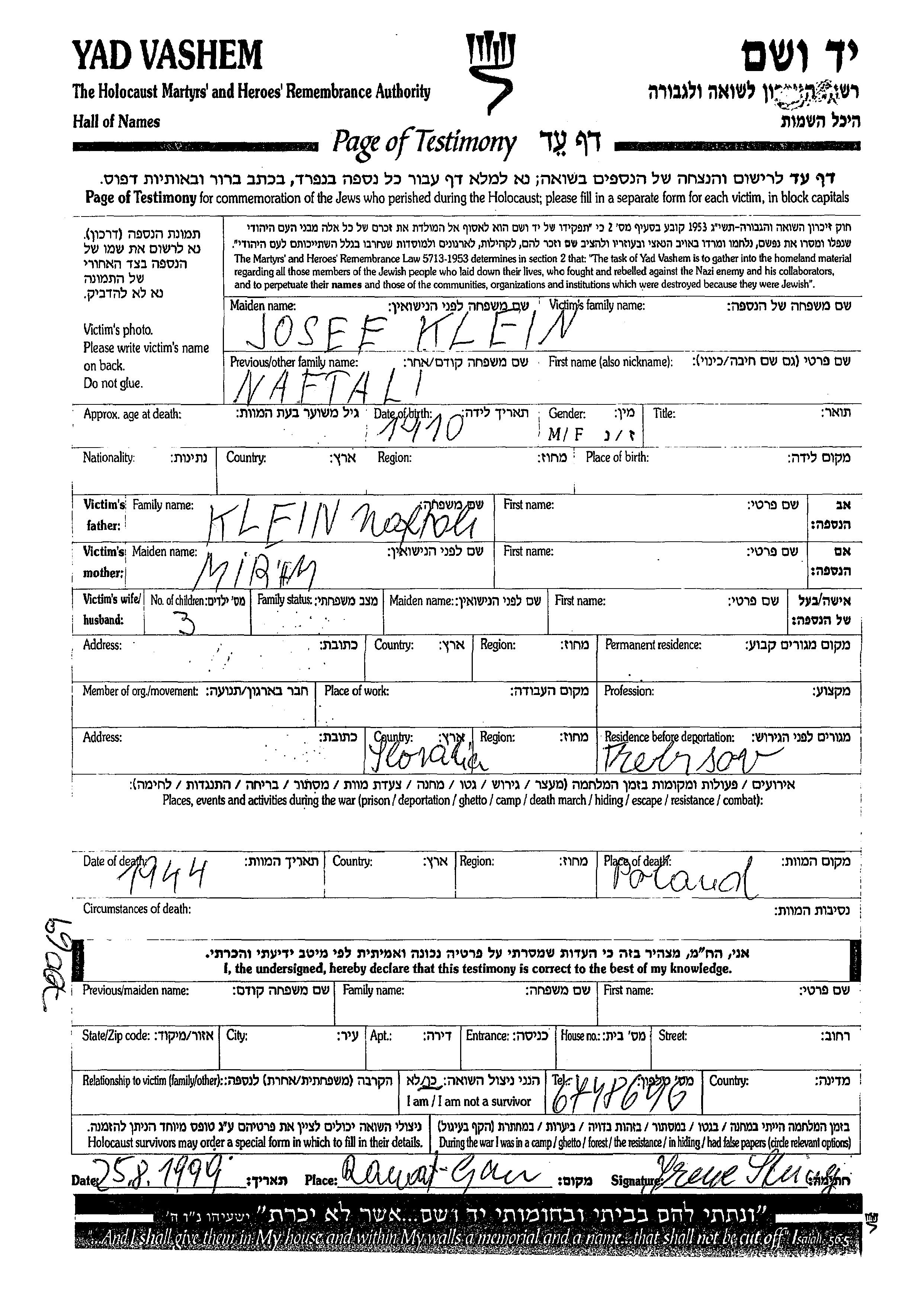 Josef Naftali Klein wurde im Jahr 1910 geboren. Er war der Sohn von Naftali und Miriam. Er war Verheiratet. Während des Krieges war er in Trebisov, Tschechoslowakei.