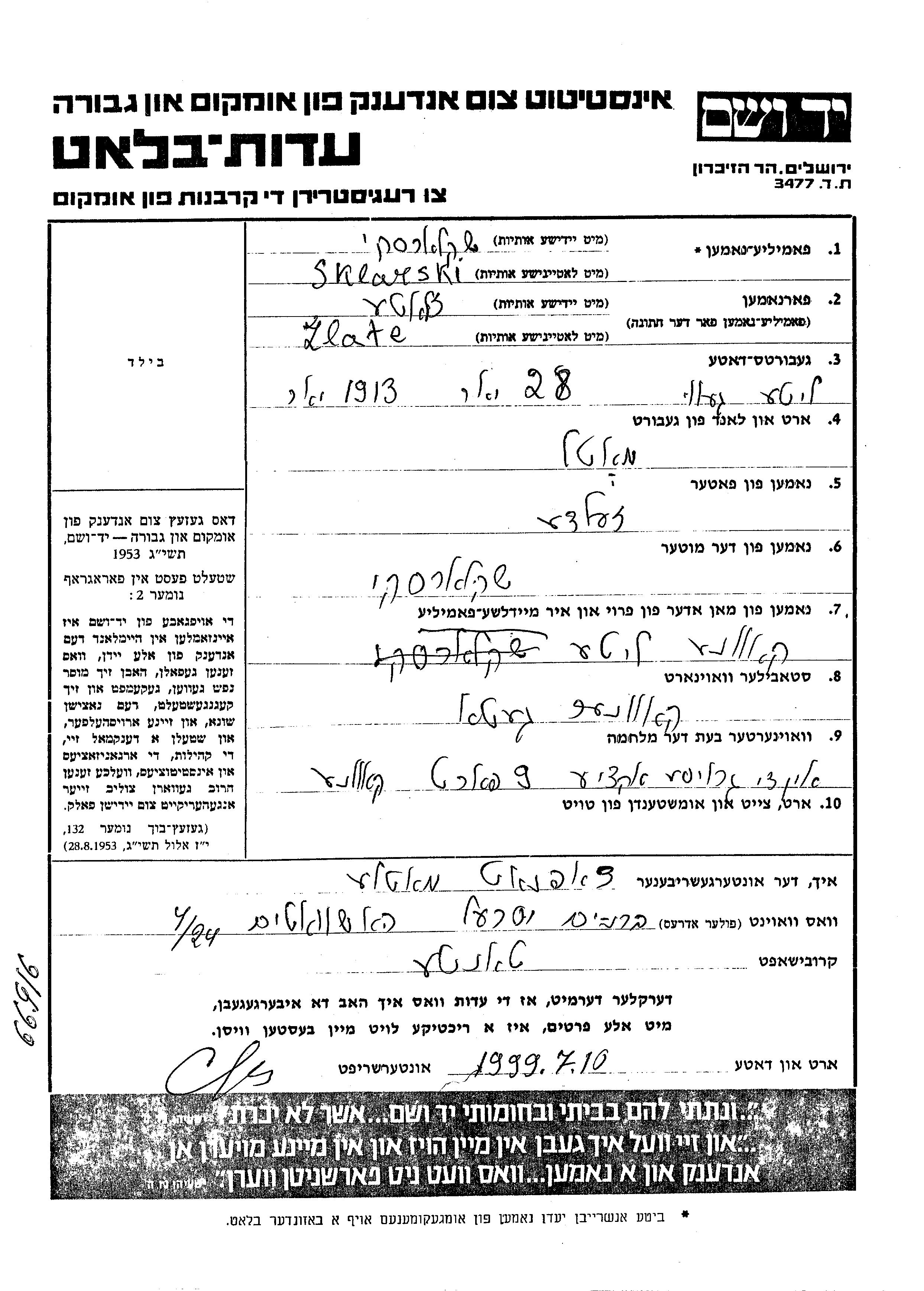 Zlate Shklarski wurde im Jahr 1913 in Kovno, Litauen geboren. Sie war die Tochter von Matl und Zelda. Vor dem Zweiten Weltkrieg lebte sie in Kowno, Litauen. Während des Krieges war sie in Kowno, Litauen.