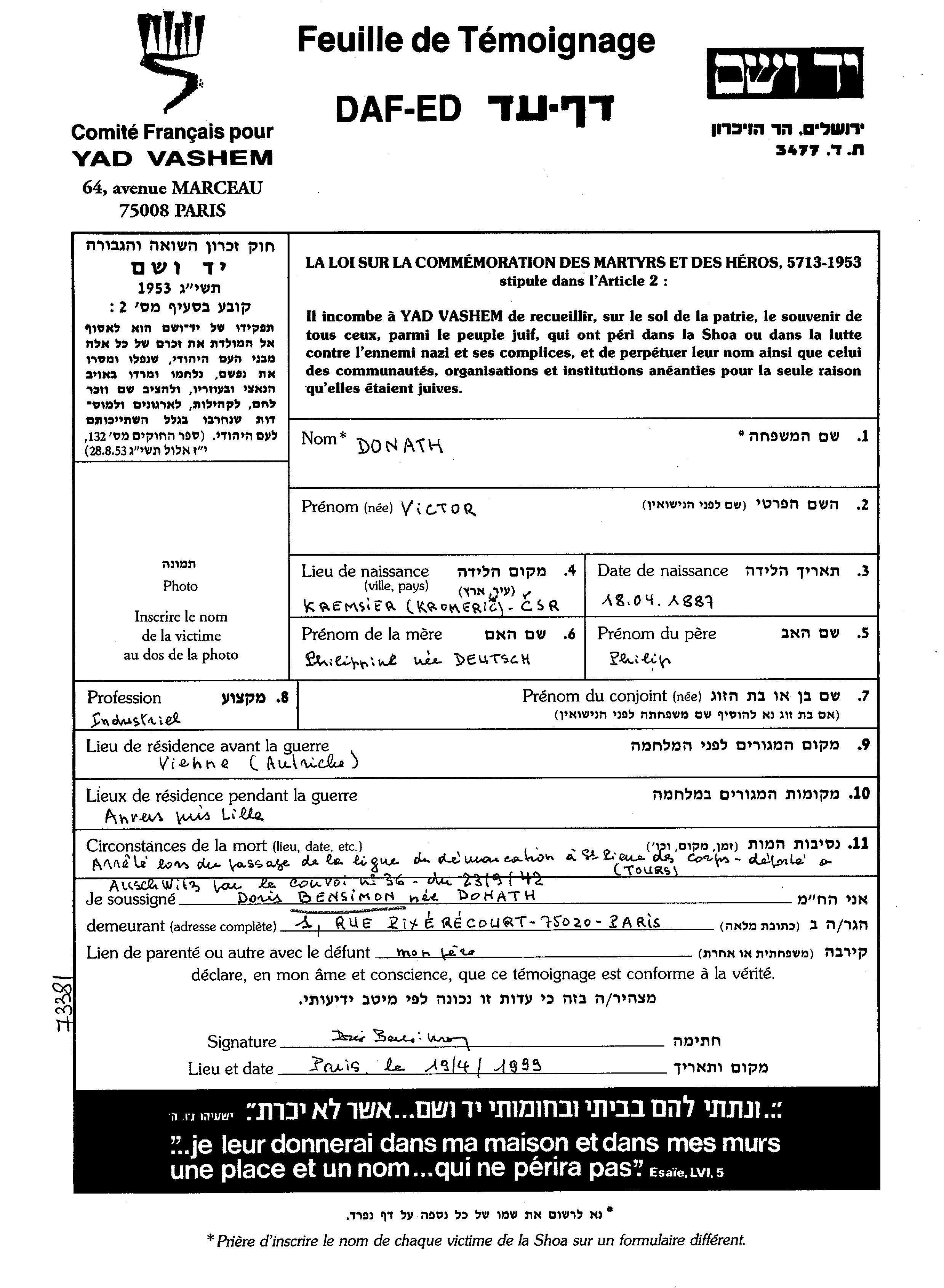 Victor Donath wurde im Jahr 1887 in Kremsier, Tschechoslowakei geboren. Er war der Sohn von Philip und Philippine. Er war Fabrikant/-in. Vor dem Zweiten Weltkrieg lebte er in Wien, Österreich. Während des Krieges war er in Lille, Frankreich.