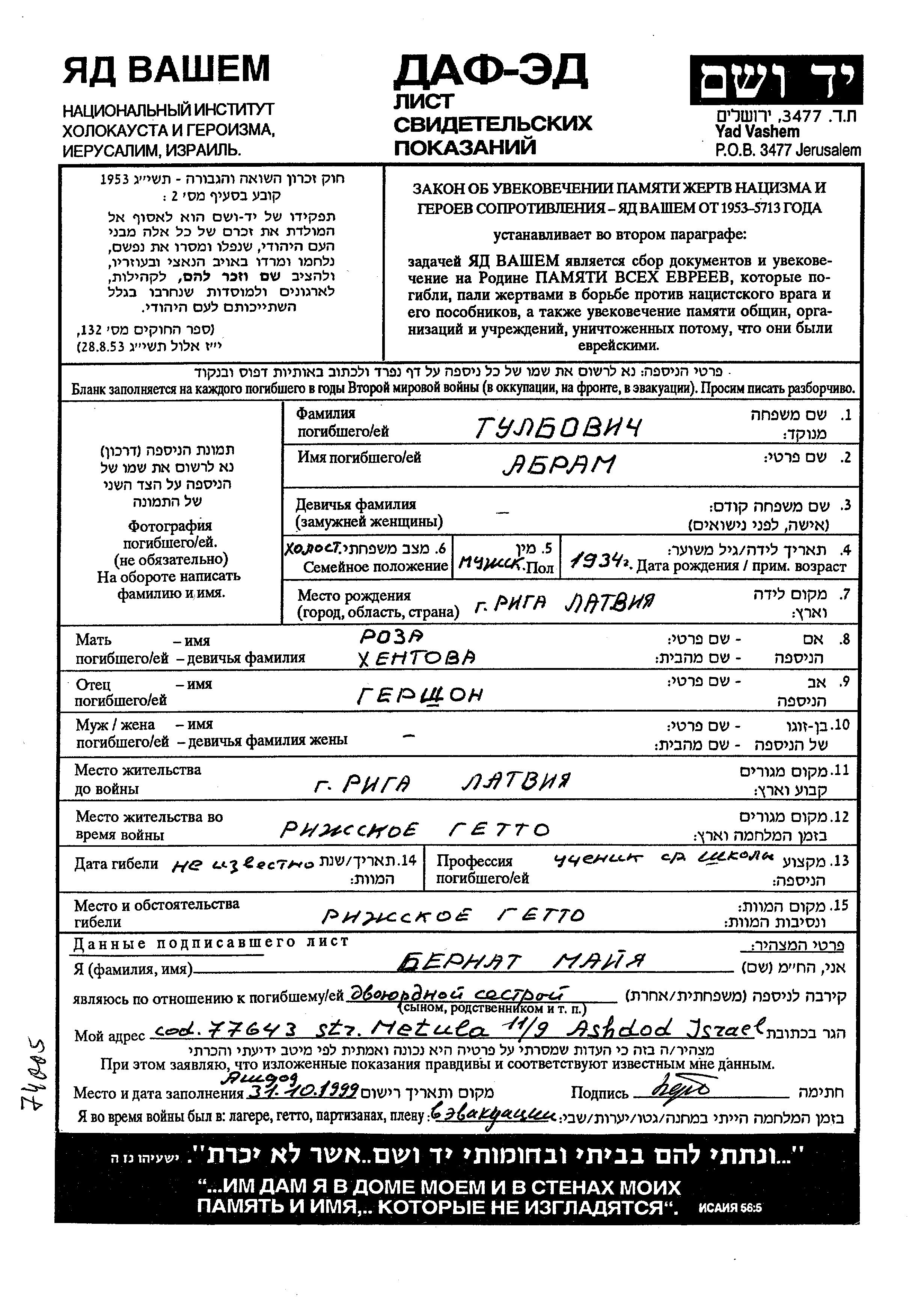 Abram Tulbovich wurde im Jahr 1934 in Riga, Lettland geboren. Er war der Sohn von Gershon und Roza. Er war Schüler/-in. Vor dem Zweiten Weltkrieg lebte er in Riga, Lettland. Während des Krieges war er in Riga, Lettland.