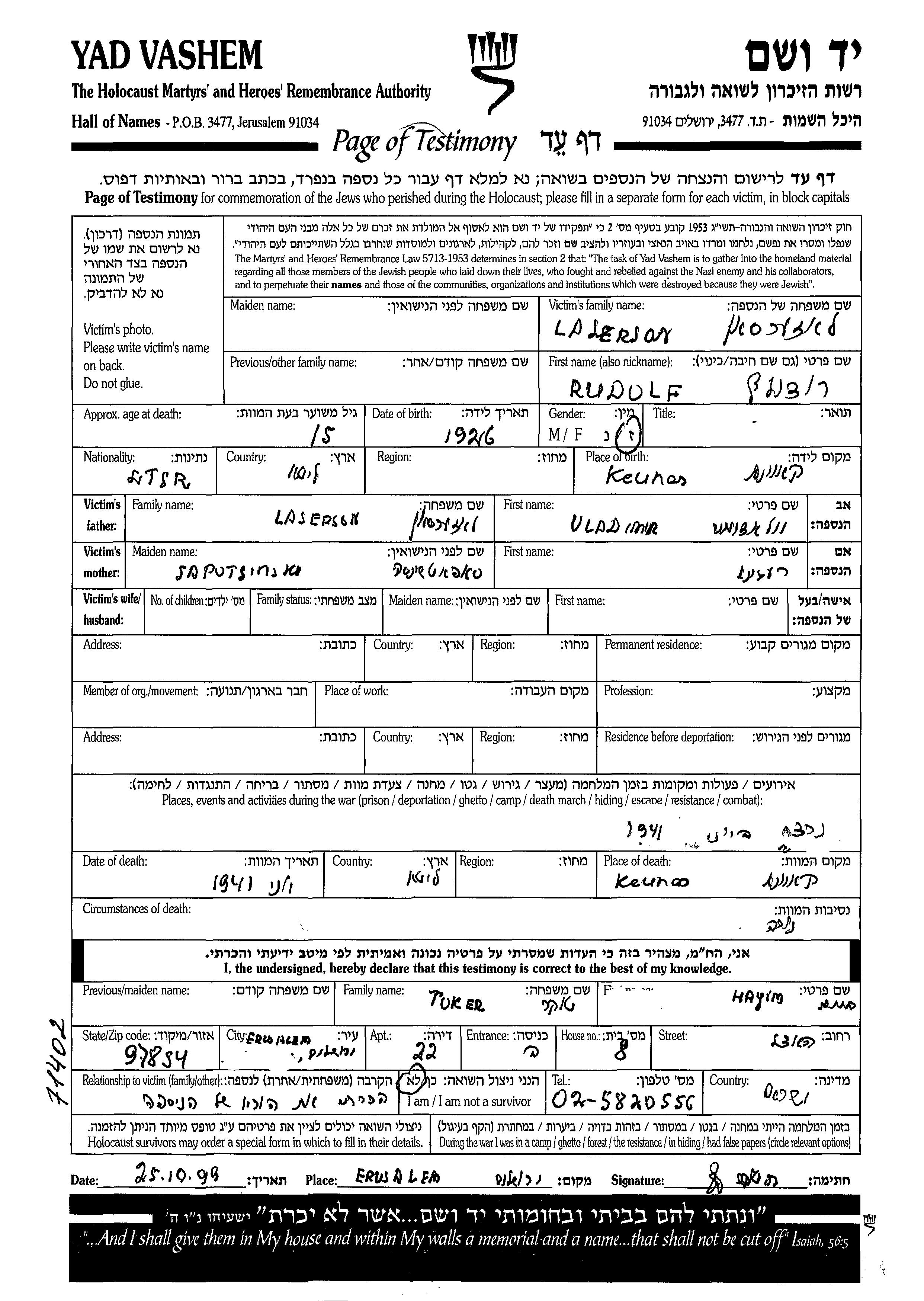 Rudolf Leizerson wurde im Jahr 1926 in Kaunas, Litauen geboren. Er war der Sohn von Vladimir und Regina. Er war Kind. Vor dem Zweiten Weltkrieg lebte er in Kaunas, Litauen. Während des Krieges war er in Kaunas, Litauen.