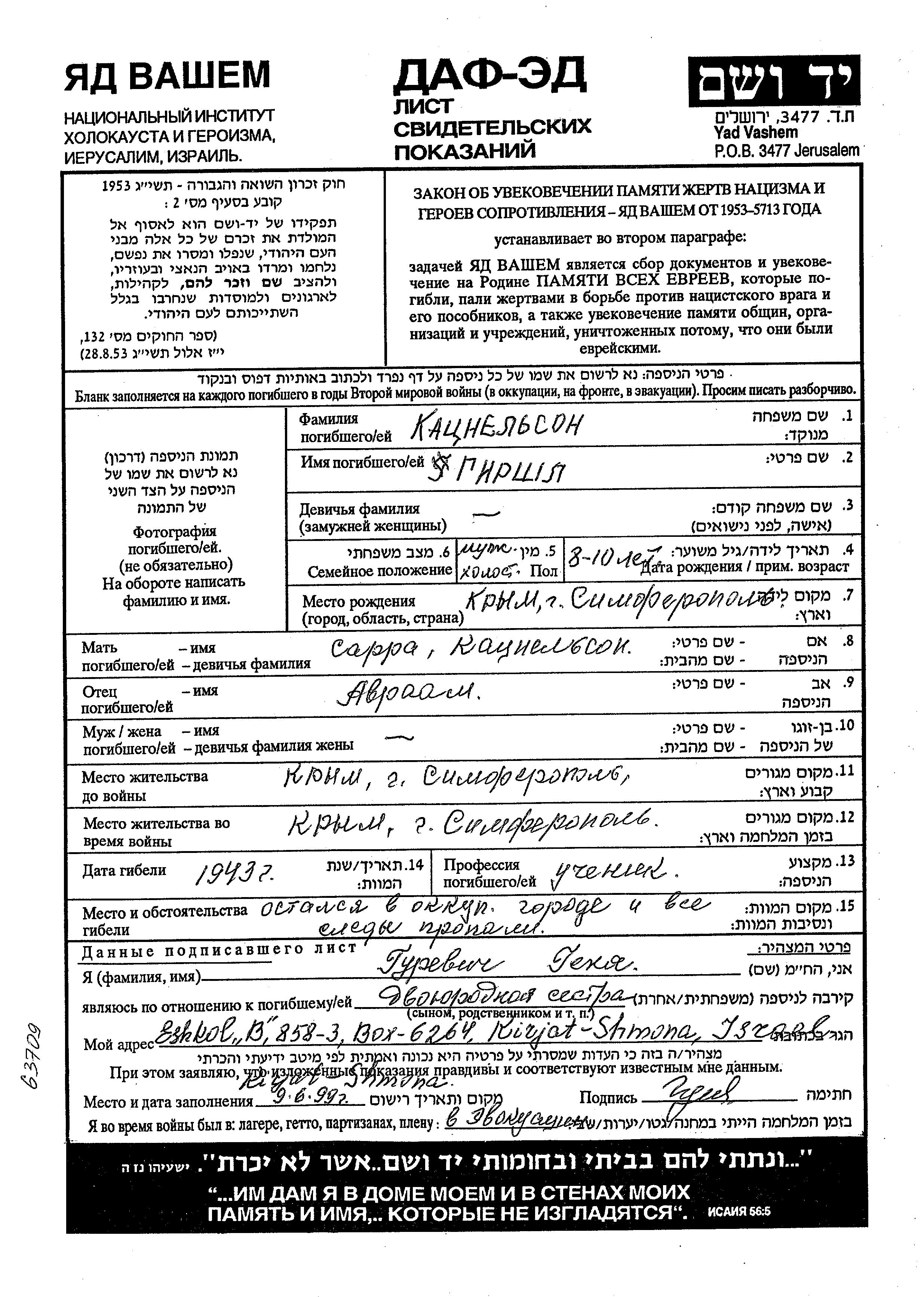 Girshl Katznelson wurde in Simferopol, Russland (UdSSR) geboren. Er war der Sohn von Avraam und Sara. Er war Schüler/-in und Kind. Vor dem Zweiten Weltkrieg lebte er in Simferopol, Russland (UdSSR). Während des Krieges war er in Simferopol, Russland (UdSSR).