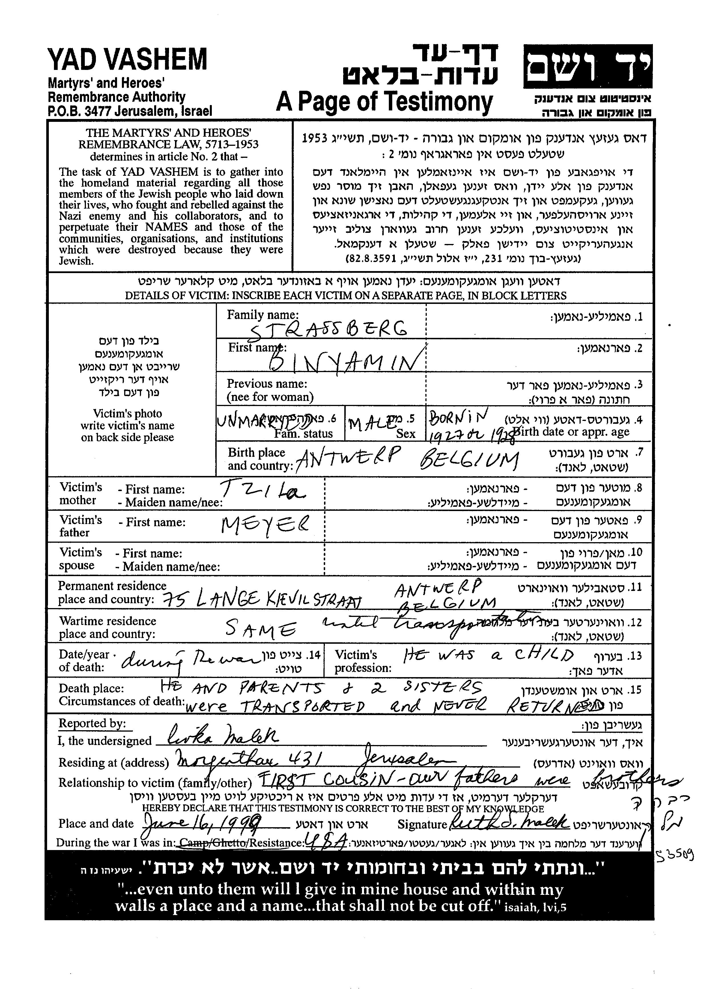 Strassberg Binyamin 1927 Antwerpen, Belgien Gedenkblatt