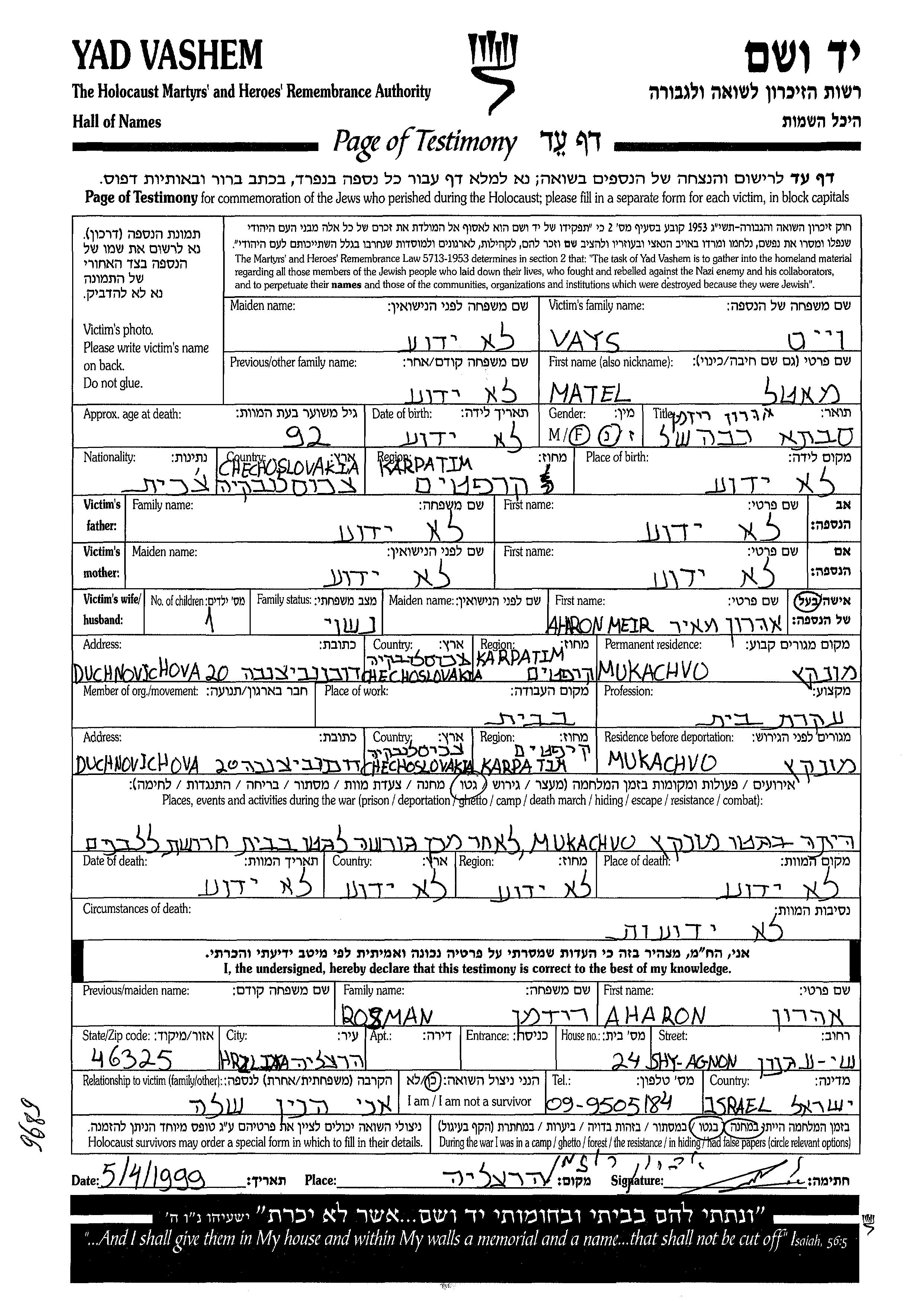 Matel Vays wurde in Carpathian Ruthenia, Tschechoslowakei geboren. Sie war Hausfrau und mit Ahron Meir Verheiratet. Vor dem Zweiten Weltkrieg lebte sie in Mukachevo, Tschechoslowakei. Während des Krieges war sie in Mukachevo, Tschechoslowakei.
