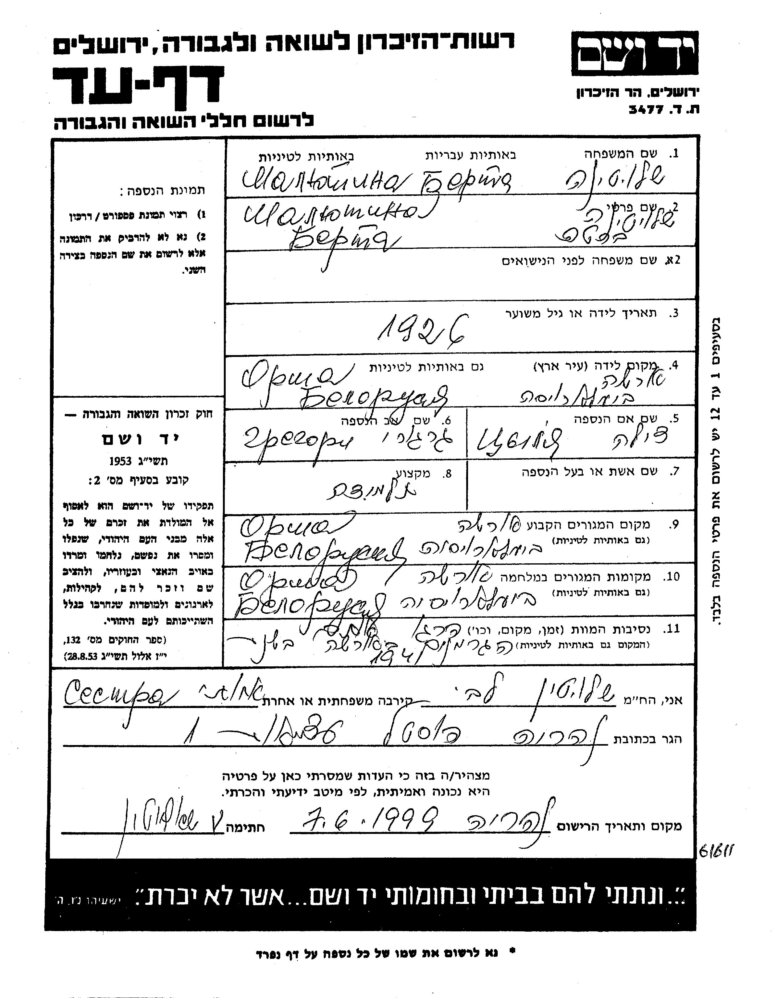 Berta wurde in der Schoah ermordet. Todesort: Orsha, Weißrussland (UdSSR) im Jahr 1941.