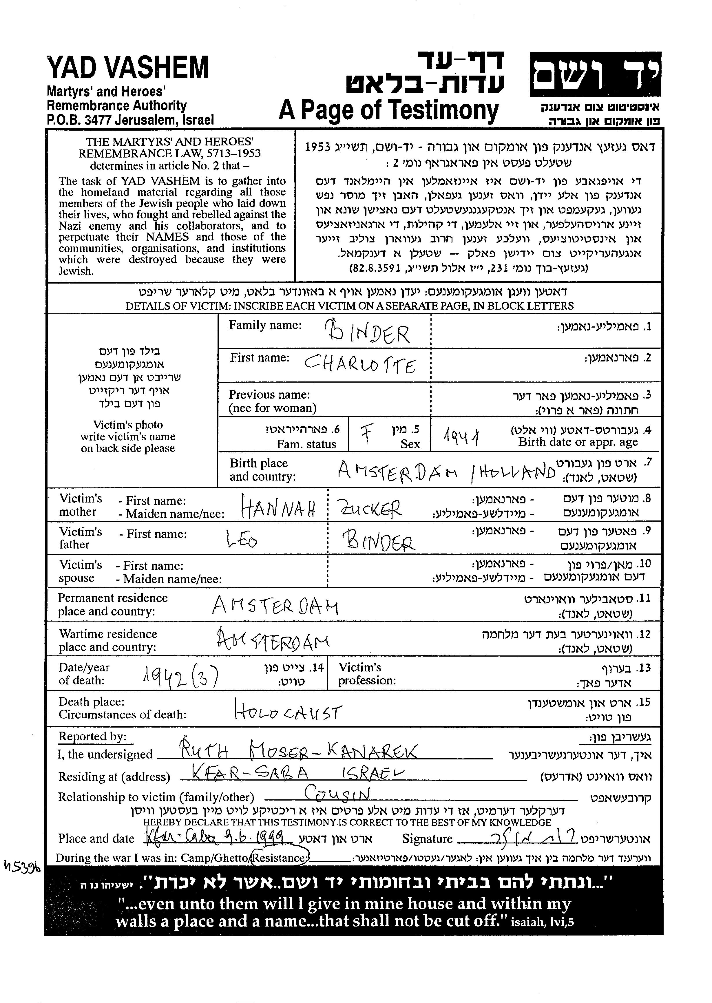 Binder Charlotte 1941 Amsterdam, Niederlande Gedenkblatt
