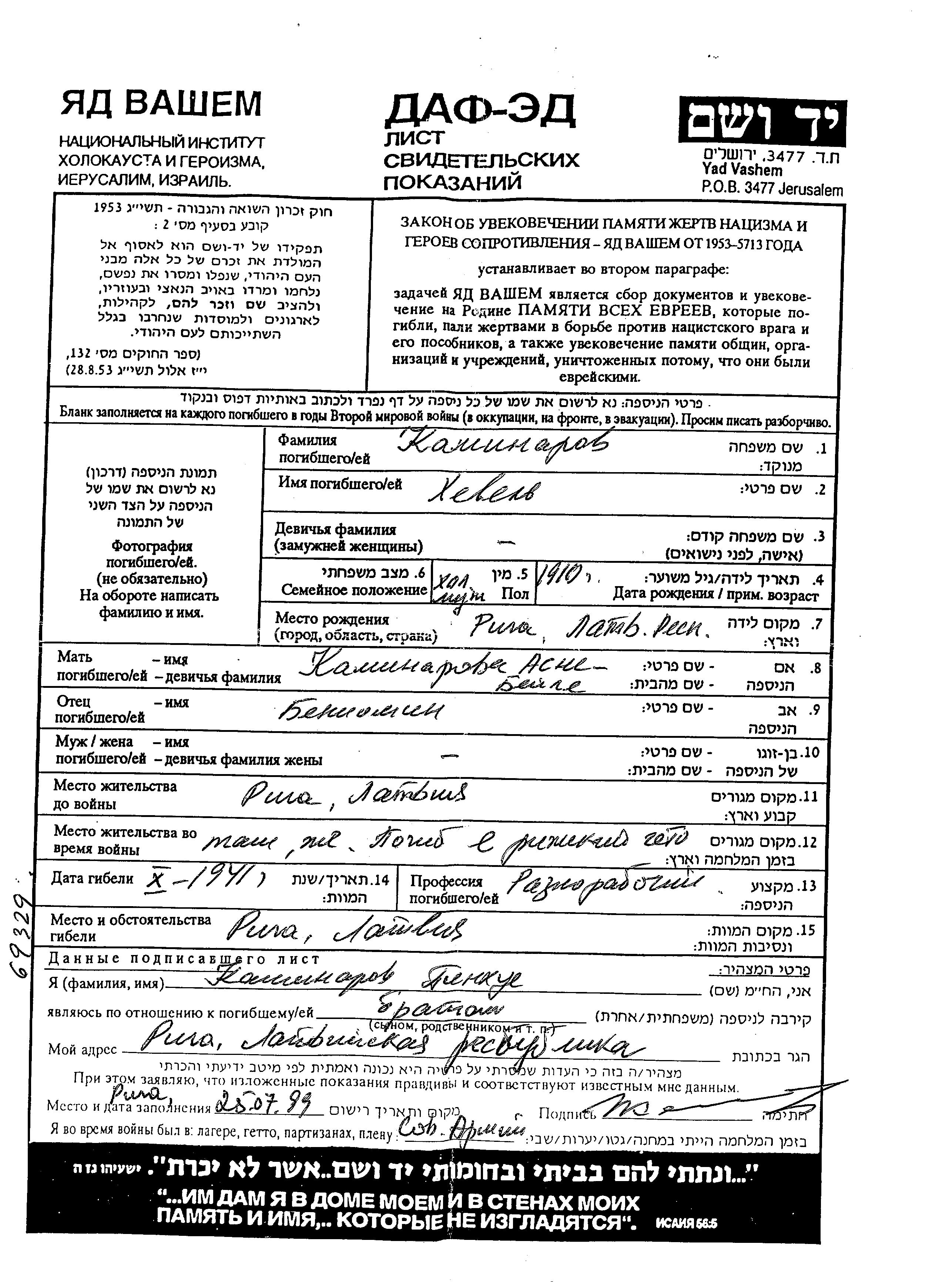 Khevel Kaminarov wurde im Jahr 1910 in Riga, Lettland geboren. Er war der Sohn von Beniomin und Asne Beile. Er war Arbeiter/-in und Ledig. Vor dem Zweiten Weltkrieg lebte er in Riga, Lettland. Während des Krieges war er in Riga, Lettland.