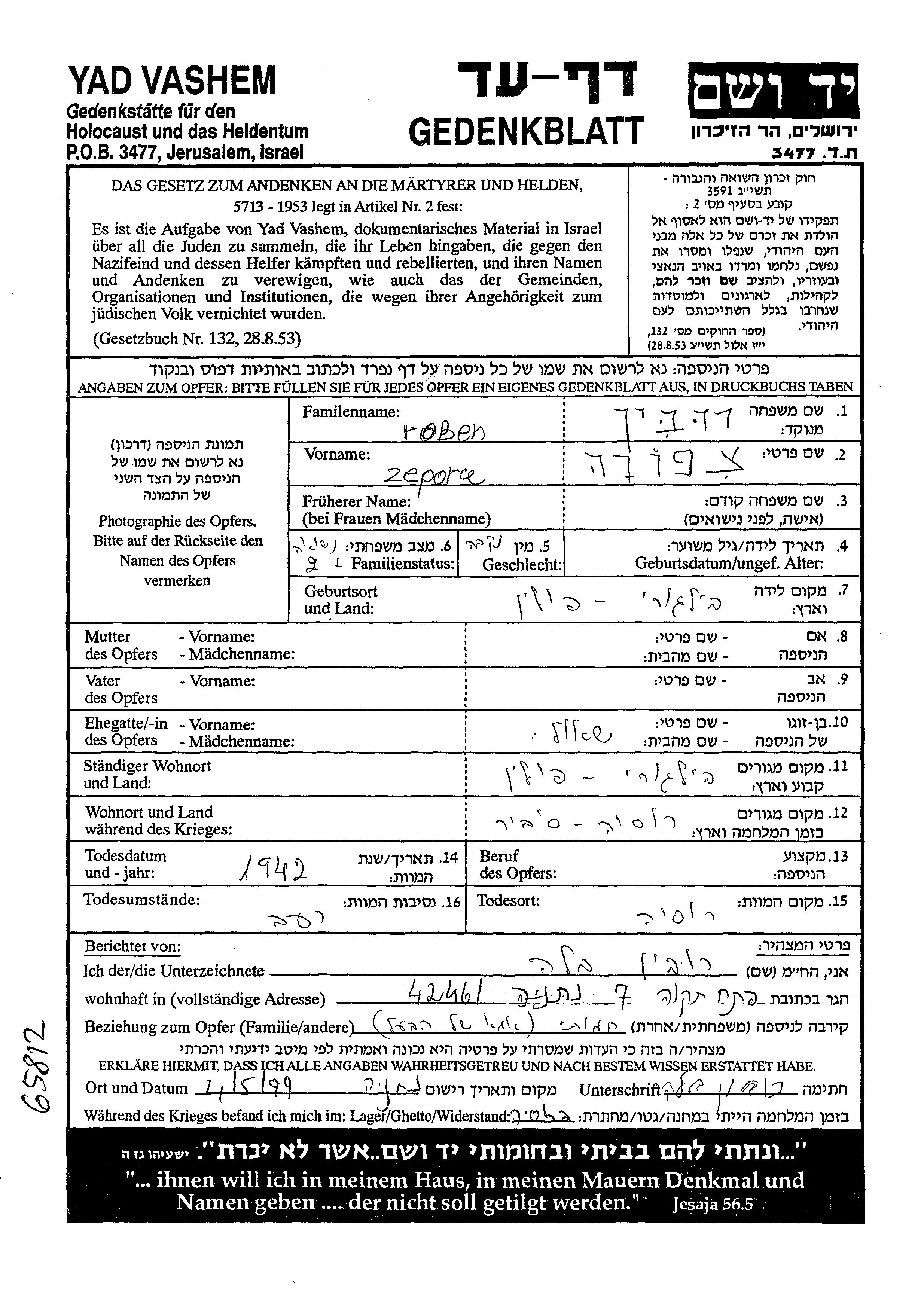 Roben Rubin Zepora Bilgoraj, Polen Gedenkblatt