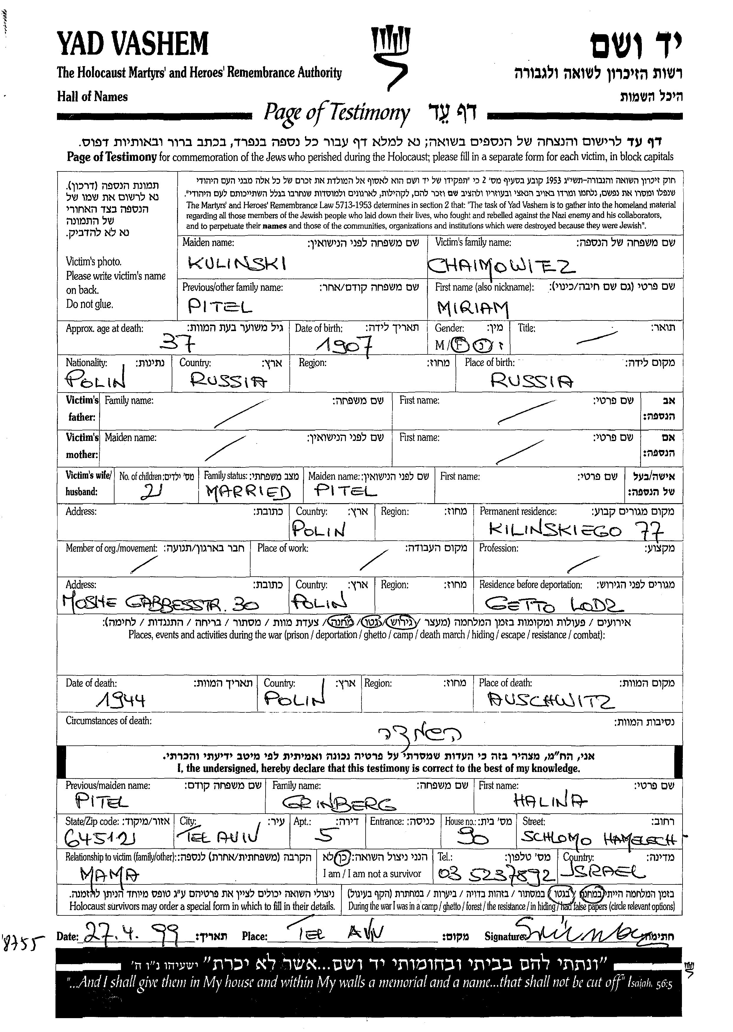 Miriam Chaimowiez Pitel, geb. Kulinski wurde im Jahr 1907 in Russland (UdSSR) geboren. Sie war Verheiratet. Vor dem Zweiten Weltkrieg lebte sie in Lodz, Polen. Während des Krieges war sie in Lodz, Polen.