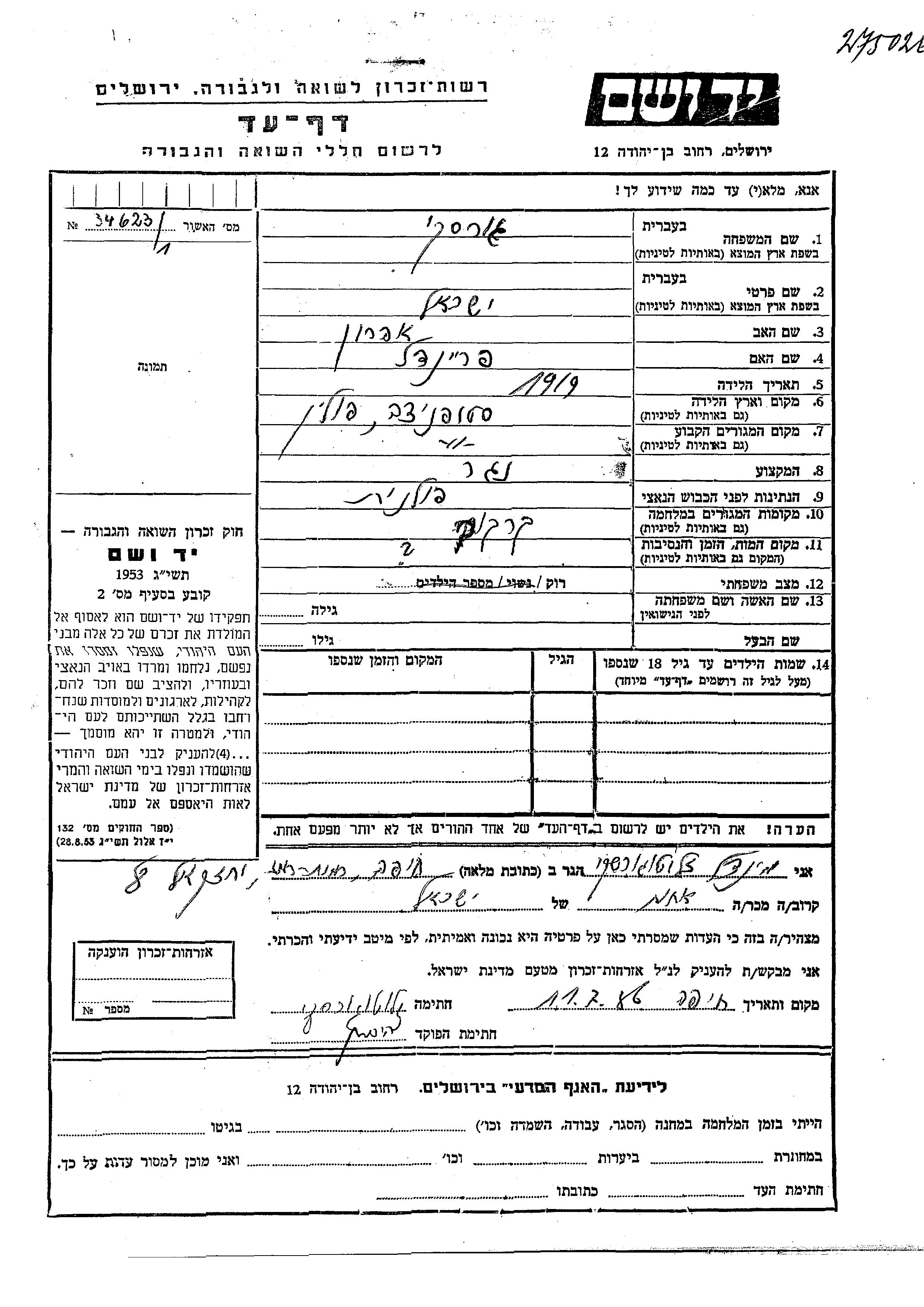 Israel Gorski wurde im Jahr 1919 in Stopnica, Polen geboren. Er war der Sohn von Aharon und Freindel. Er war Zimmermann und Ledig. Vor dem Zweiten Weltkrieg lebte er in Stopnica, Polen. Während des Krieges war er in Krakow, Polen.